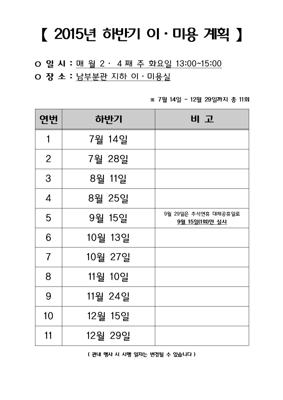 2015년 남부분관 '하반기 이·미용 계획' 알림