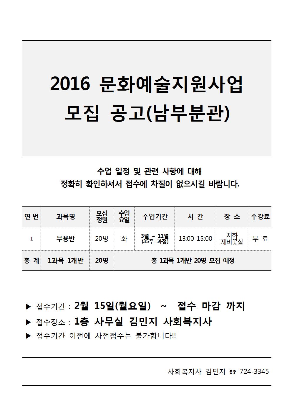2016 문화예술지원사업 모집 공고(남부분관)