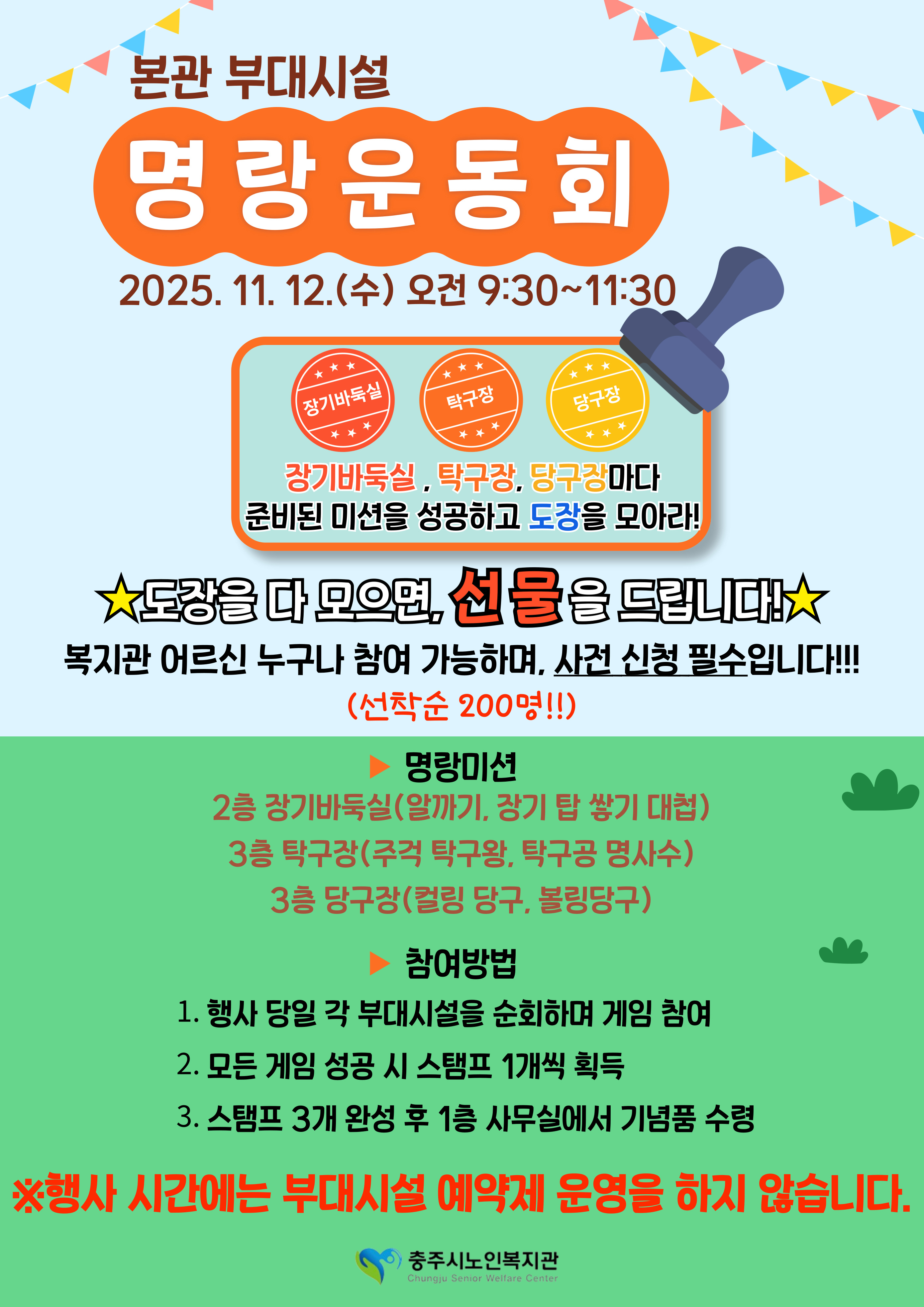 탁구장, 당구장, 장기바둑실 마다 준비된 게임을 모두 통과하고 도장을 모아보세요!!
