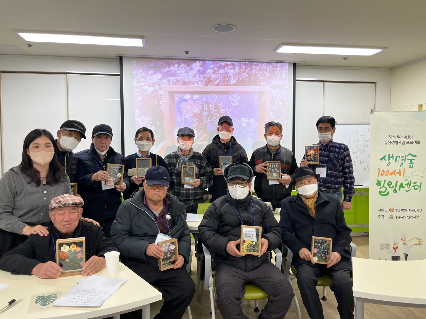 "생명숲100세힐링센터"는 혼자 지내는 남성 어르신의 일상생활자립 및 사회성 증진 프로그램을 통해 자립역량을 강화하여 건강하고 행복한 노후를 보내실 수 있도록 지원하는 프로그램으로 생명보험사회공헌재단의 지원을 받아 운영하고 있습니다.