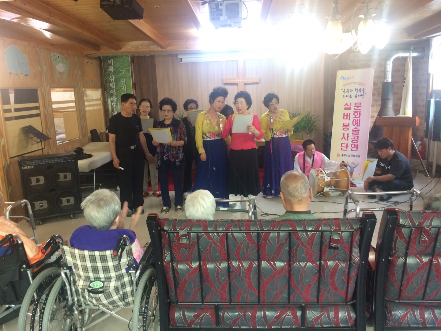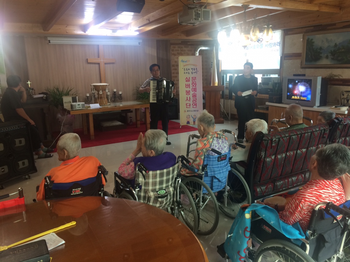2017년 9월 26일 충주시노인복지관 문화예술공연팀은 로뎀나무요양원에 방문하여 그동안 복지관에서 갈고 닦은 공연 실력을 뽐내는 시간을 가졌습니다. 자원봉사자와 요양원 어르신이 하나되어 즐겁고 보람 있는 시간을 만들었습니다. 협조해주신 로뎀나무요양원 어르신 및 관계자 분들과 문화예술공연 봉사자님들에게 감사드립니다.