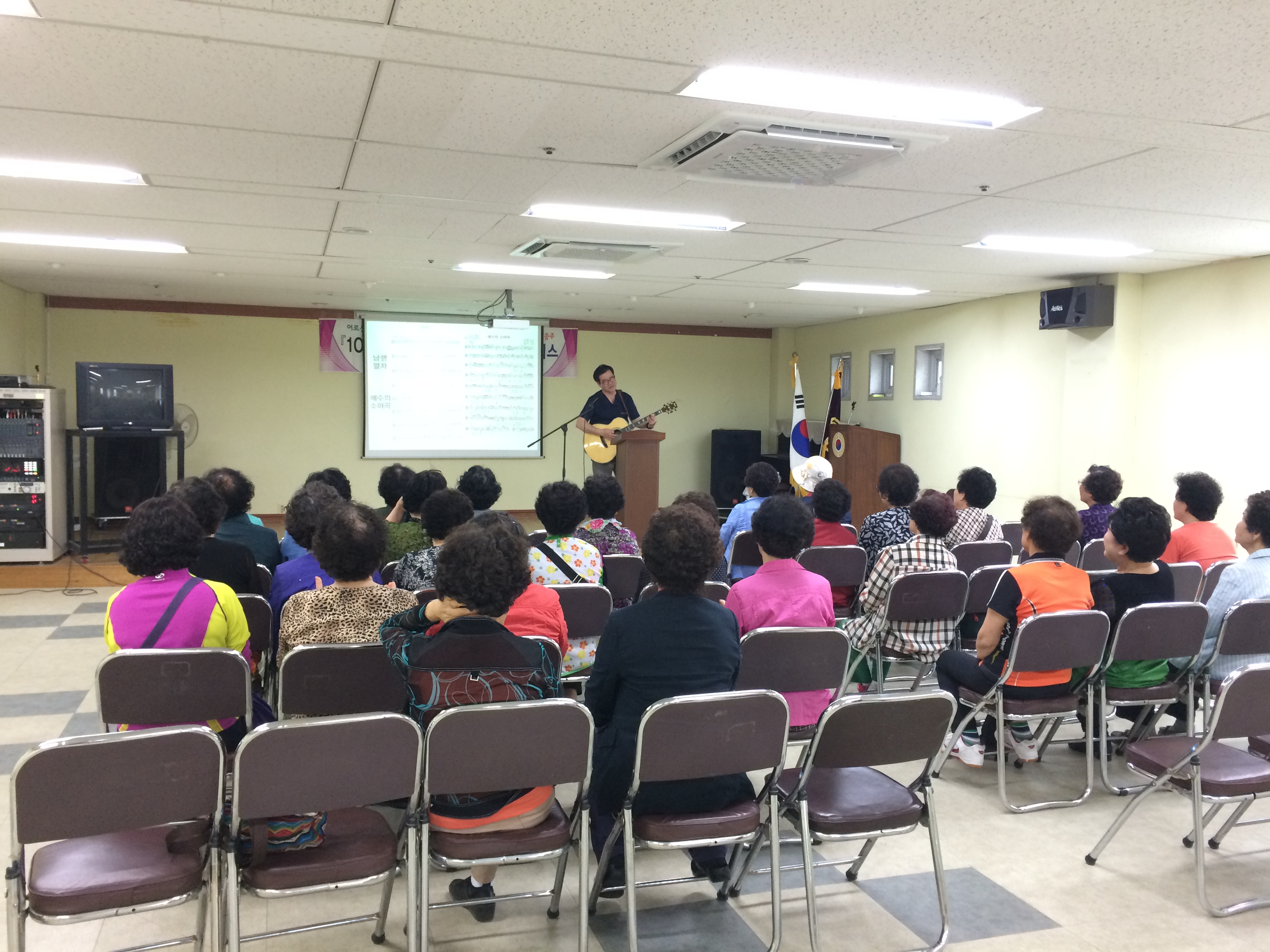 충주의료원 산부인과 김병창교수님께서 '건강하게 나이들어 가기'라는 주제로 교수님의 기타연주를 시작으로 강의를 하였습니다.