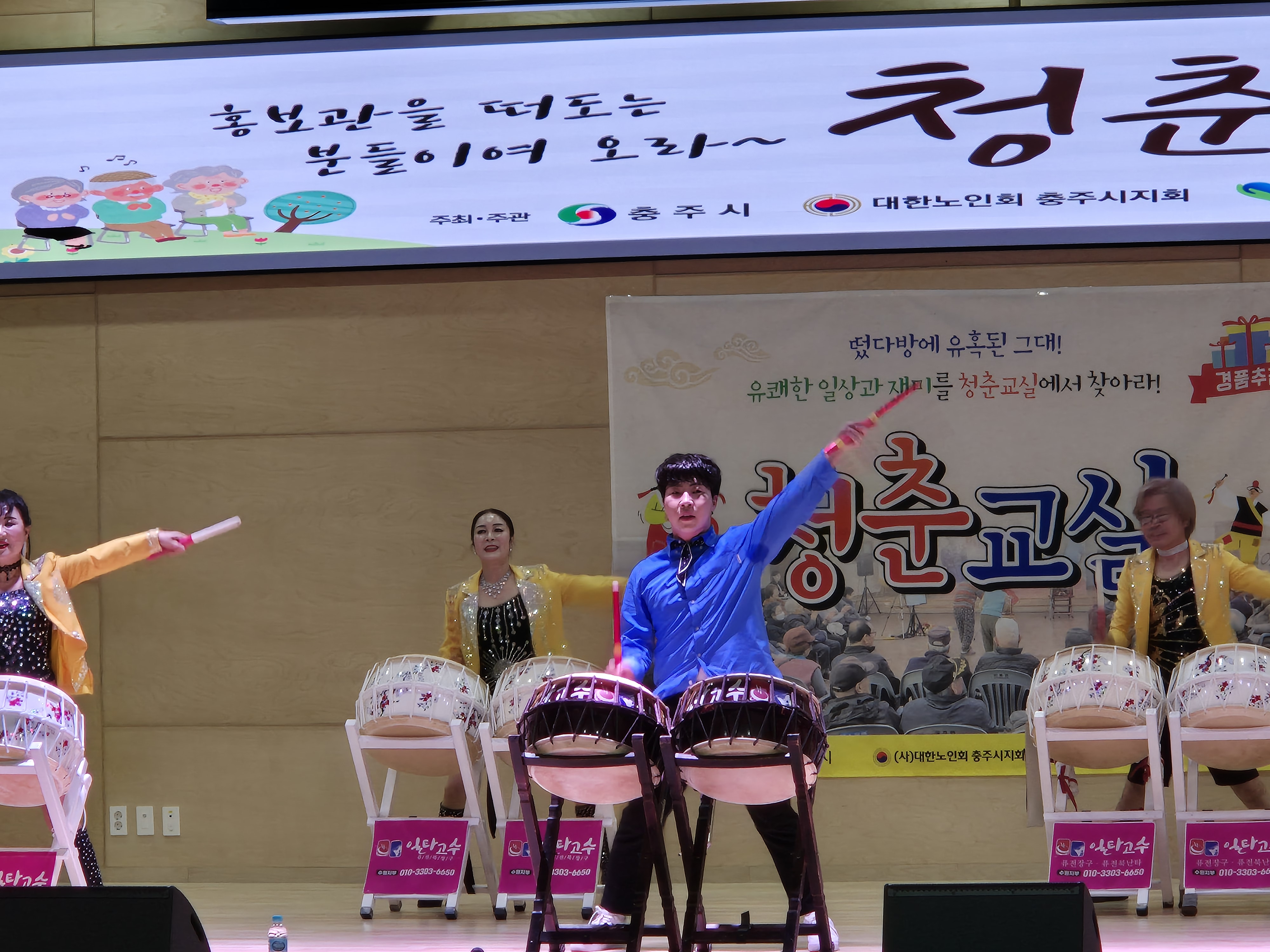 마지막으로 4월 29일(화)에는 교현안림동을 대상으로 충주시노인복지관 동부분관에서 장구계의 일타고수 임형규 강사님의 신나는 장구공연이 있었습니다.
