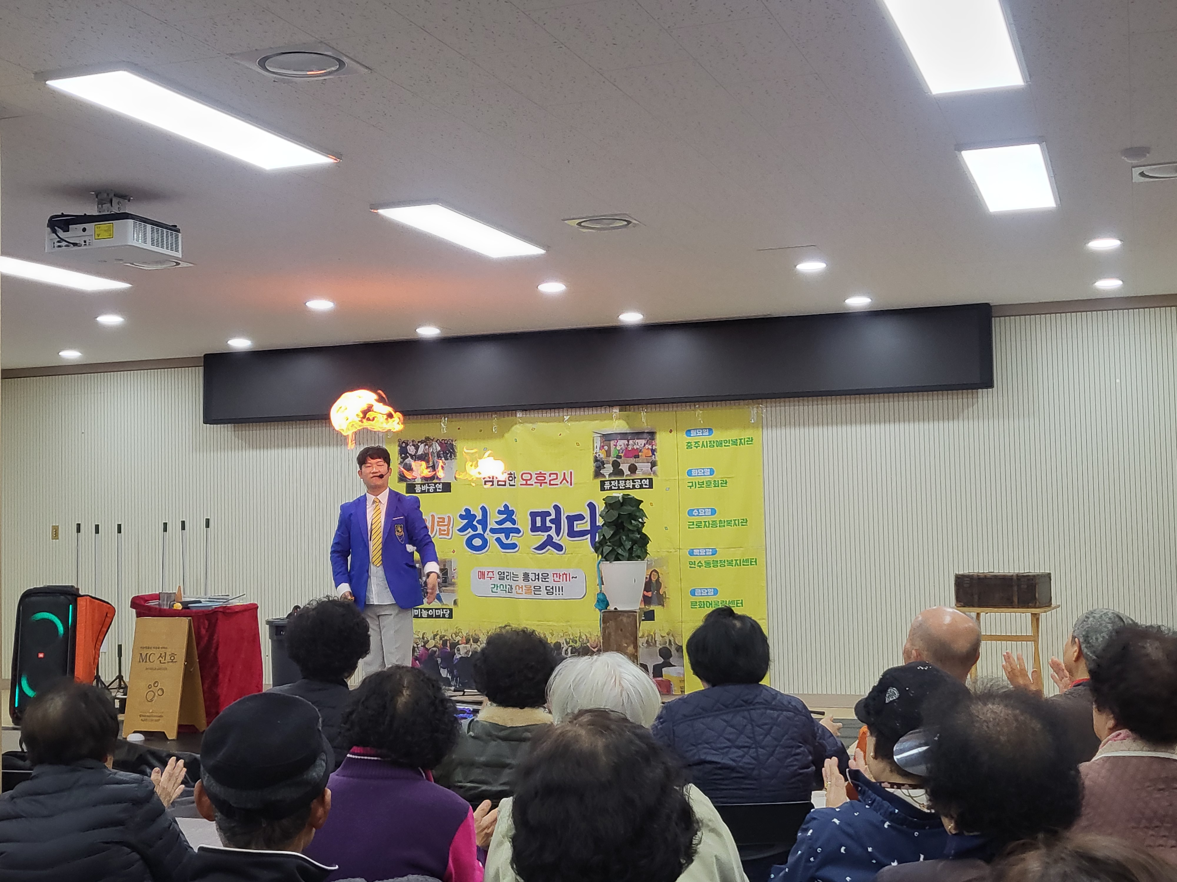 시립청춘떳다방은 11월 4주간 동안 매일 오후 2시에 충주 시내 5개 거점 시설에서 다양한 공연을 진행하여 추운 날씨에도 어르신들께 즐거움과 웃음을 선사하였습니다.