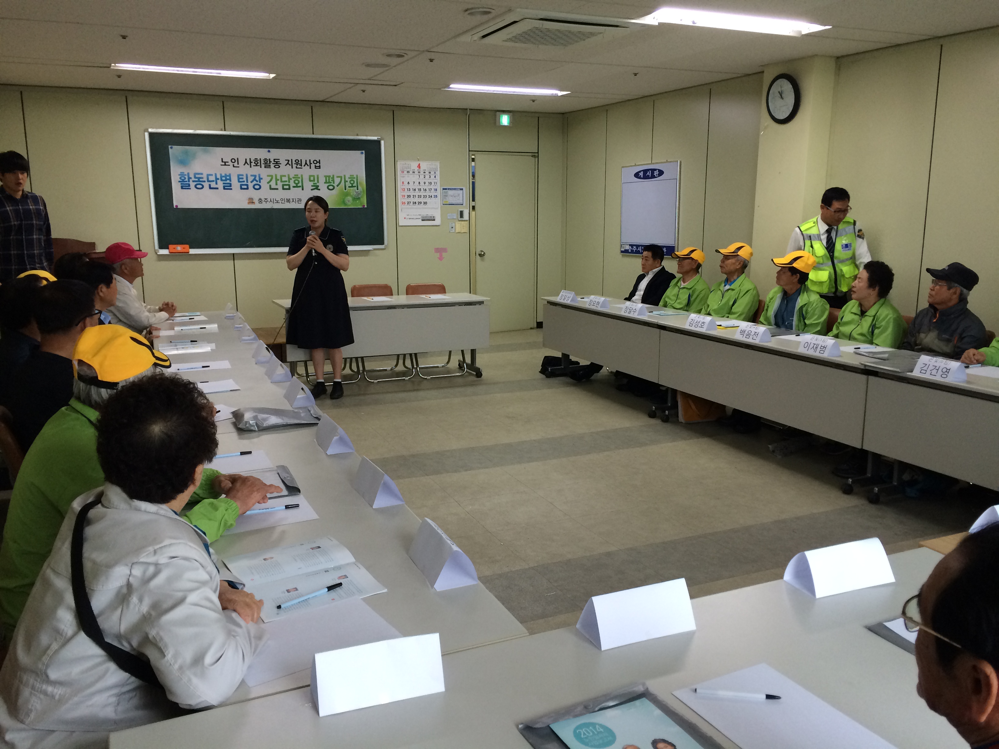 4월 29일 노인 사회활동 지원사업 활동단별 팀장 간담회를 실시하였습니다.간담회 전 팀장님을 통해 간단한 안전교육을 실시하였고 활동단별 건의사항 및 의견 공유를 하는 시간을 가졌습니다.