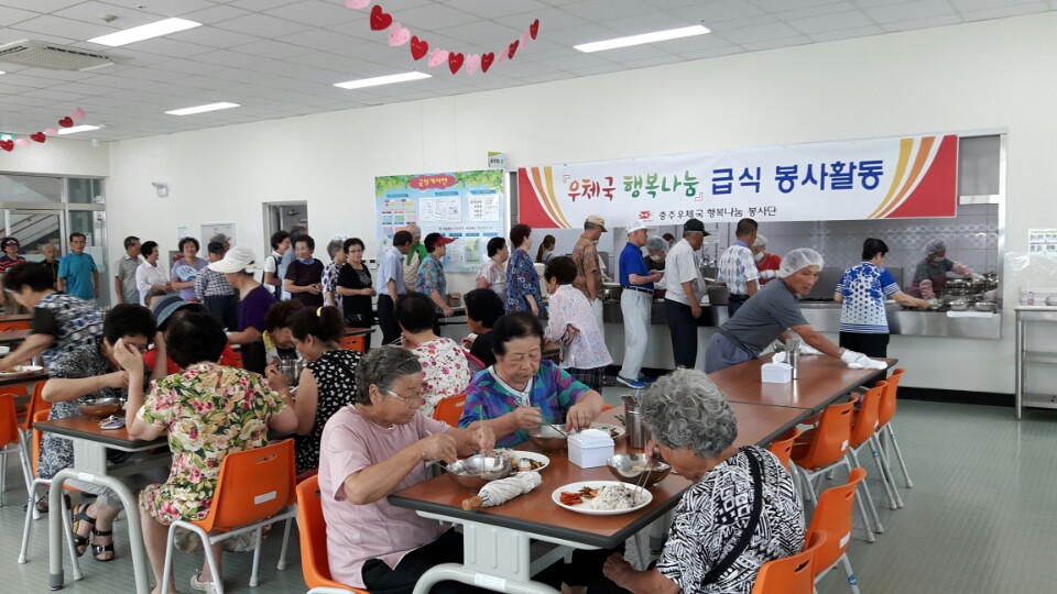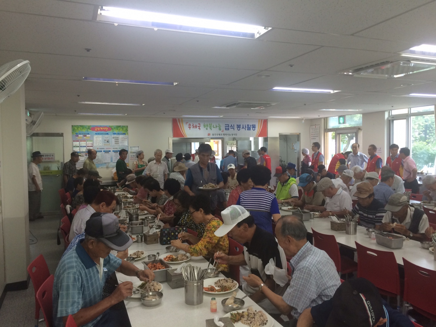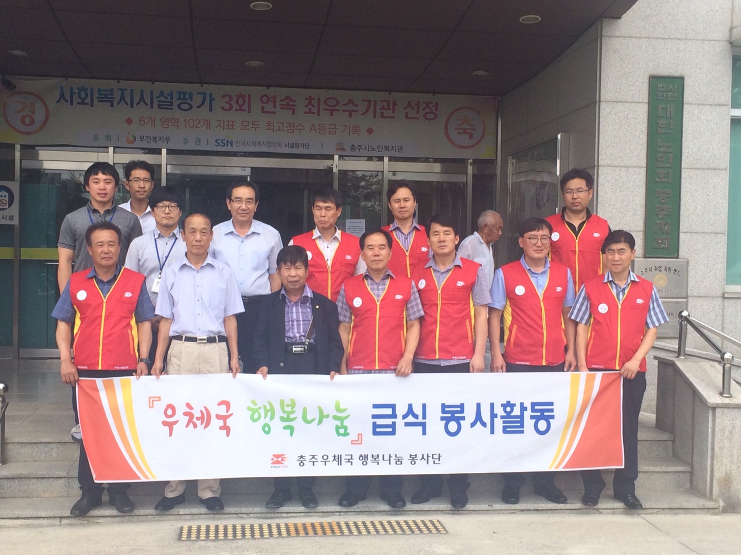 지난 16일 충주우체국이 말복을 맞이하여 충주시노인복지관 본관, 분관을 찾아 500여명의 지역 어르신들을 대상으로 삼계탕을 제공하는 행복나눔 후원 및 무료급식 봉사활동을 실시하였습니다. 이날 행사는 충주우체국 직원 10여명과 지역 자원봉사자, 충주시노인복지관 직원 등이 참여하여 계속되는 무더위에 지친 지역 내 어르신들께 몸보신의 삼계탕을 제공하며, 섬김을 실천하는 보람있는 시간이였습니다.