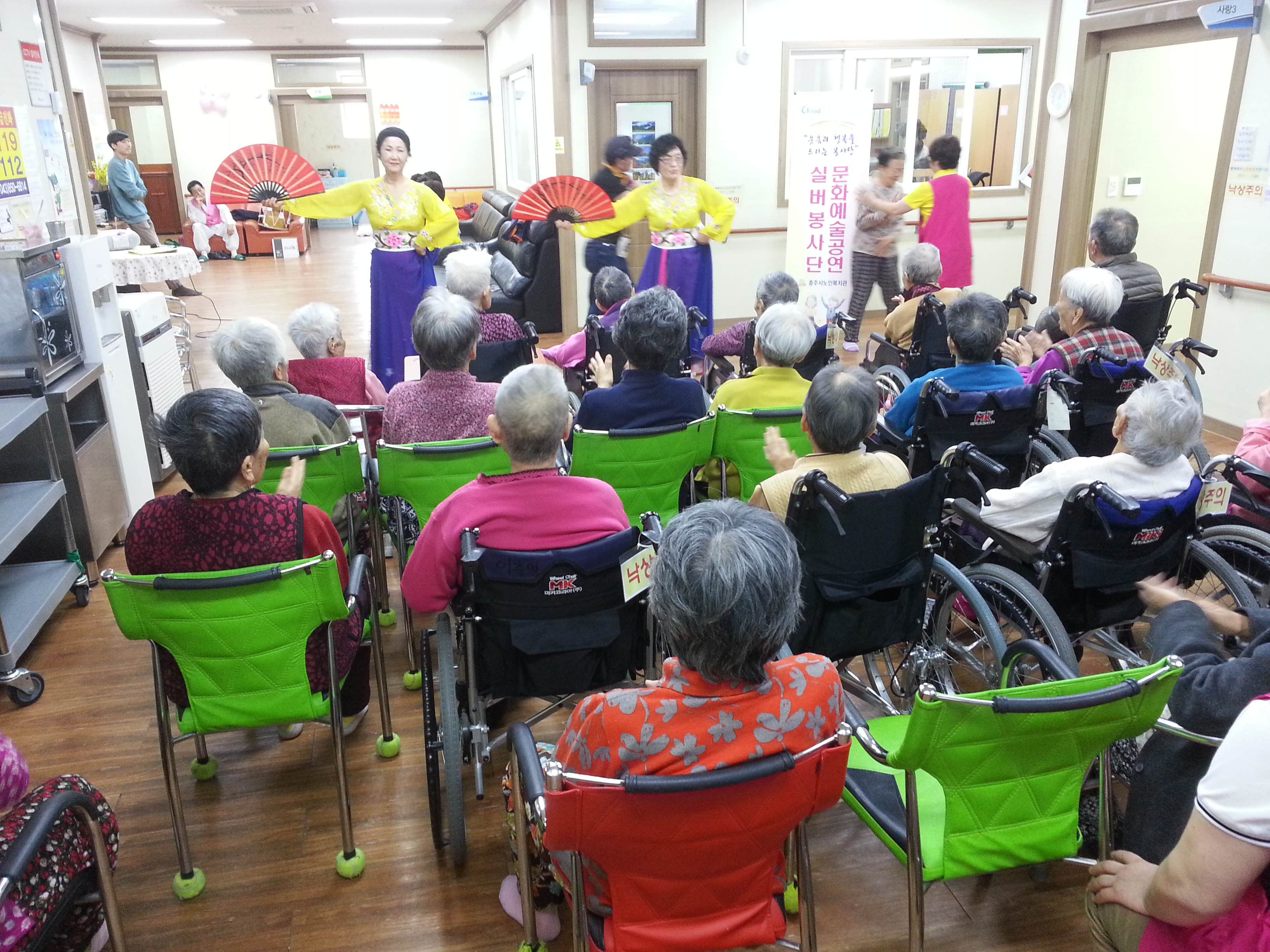 4월 14일 충주시노인복지관 문화예술공연팀은 충주요양원을 방문하여 그동안 복지관에서 갈고 닦은 공연 실력을 뽐내는 시간을 가졌습니다. 자원봉사자와 요양원 어르신이 하나되어 즐겁고 보람 있는 시간을 만들었습니다. 협조해주신 충주요양원 관계자 분들과 자원봉사자분들에게 감사합니다.
