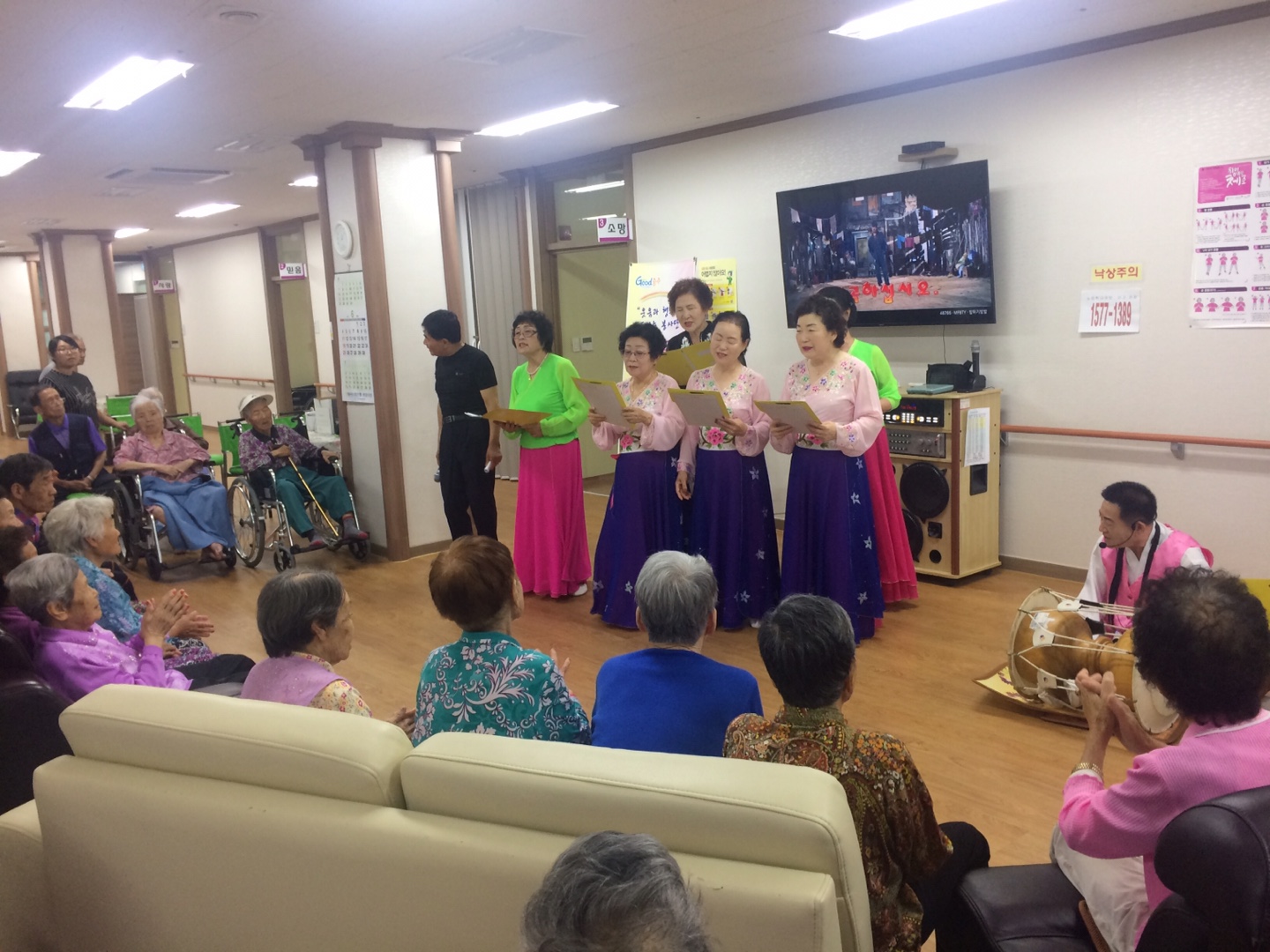 2017년 6월 29일 충주시노인복지관 문화예술공연팀은 충주치매전문요양원에 방문하여 그동안 복지관에서 갈고 닦은 공연 실력을 뽐내는 시간을 가졌습니다. 자원봉사자와 요양원 어르신이 하나되어 즐겁고 보람 있는 시간을 만들었습니다. 협조해주신 충주치매전문요양원 어르신 및 관계자 분들과 문화예술공연 봉사자님들에게 감사합니다.
