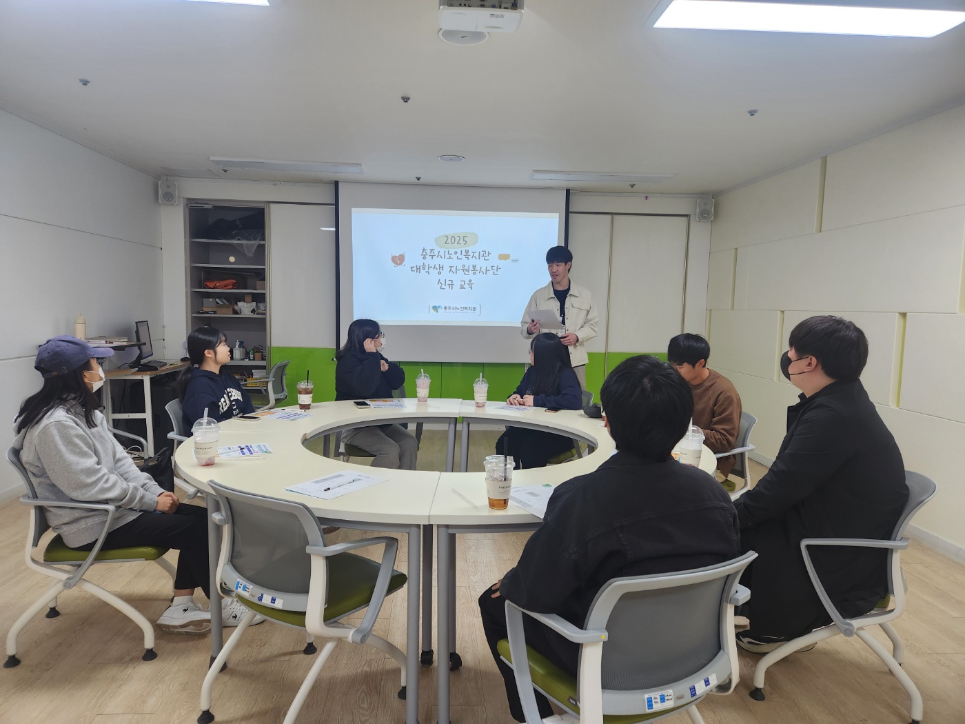 2025. 4. 3.(목) 충주시노인복지관 본관에서 대학생 자원봉사단 첫 모임과 함께 신규 교육을 실시하였습니다.