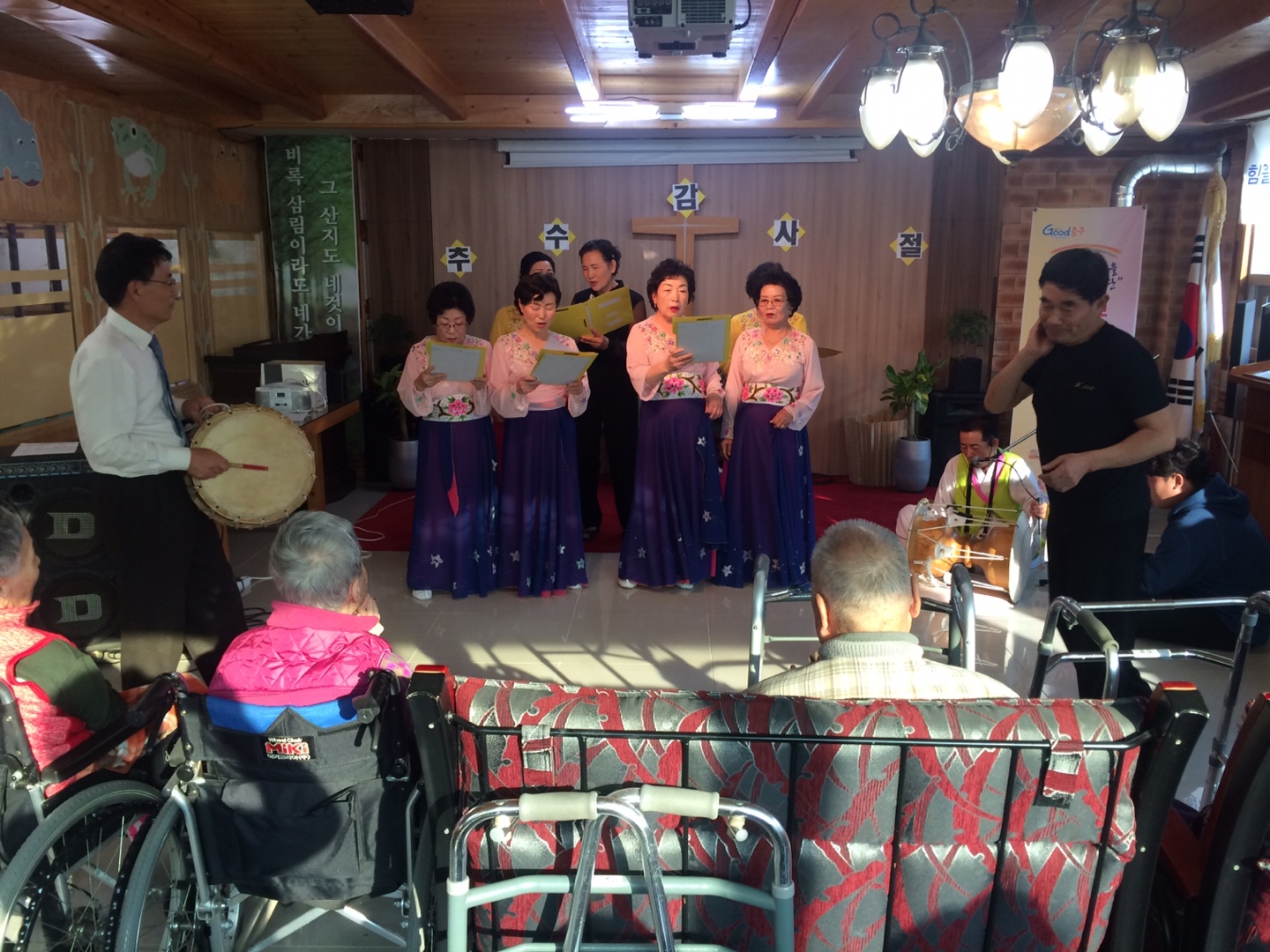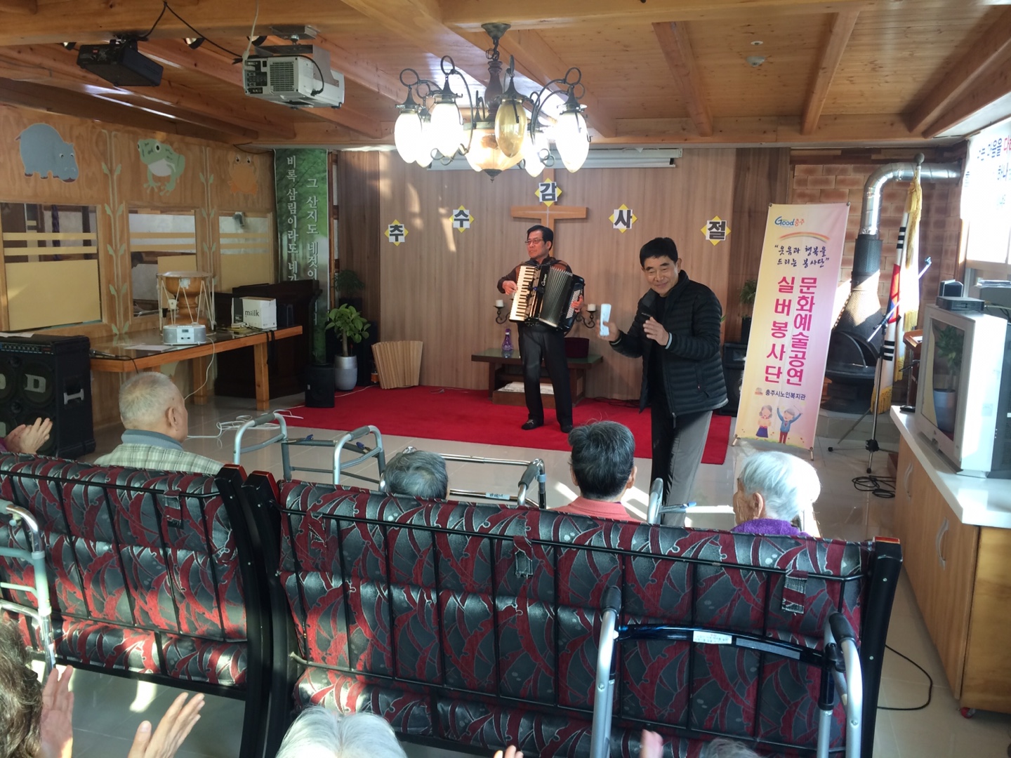 2017년 11월 28일 충주시노인복지관 문화예술공연팀은 로뎀나무요양원에 방문하여 그동안 복지관에서 갈고 닦은 공연 실력을 뽐내는 시간을 가졌습니다. 자원봉사자와 요양원 어르신이 하나되어 즐겁고 보람 있는 시간을 만들었습니다. 협조해주신 로뎀나무요양원 어르신 및 관계자 분들과 문화예술공연 봉사자님들에게 감사드립니다.