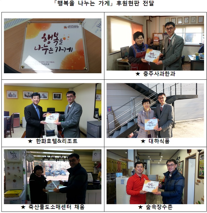충주시 어르신을 위해 나눔을 실천하는 고마운 가게를 선정하여 후원현판을 전달 하였습니다.