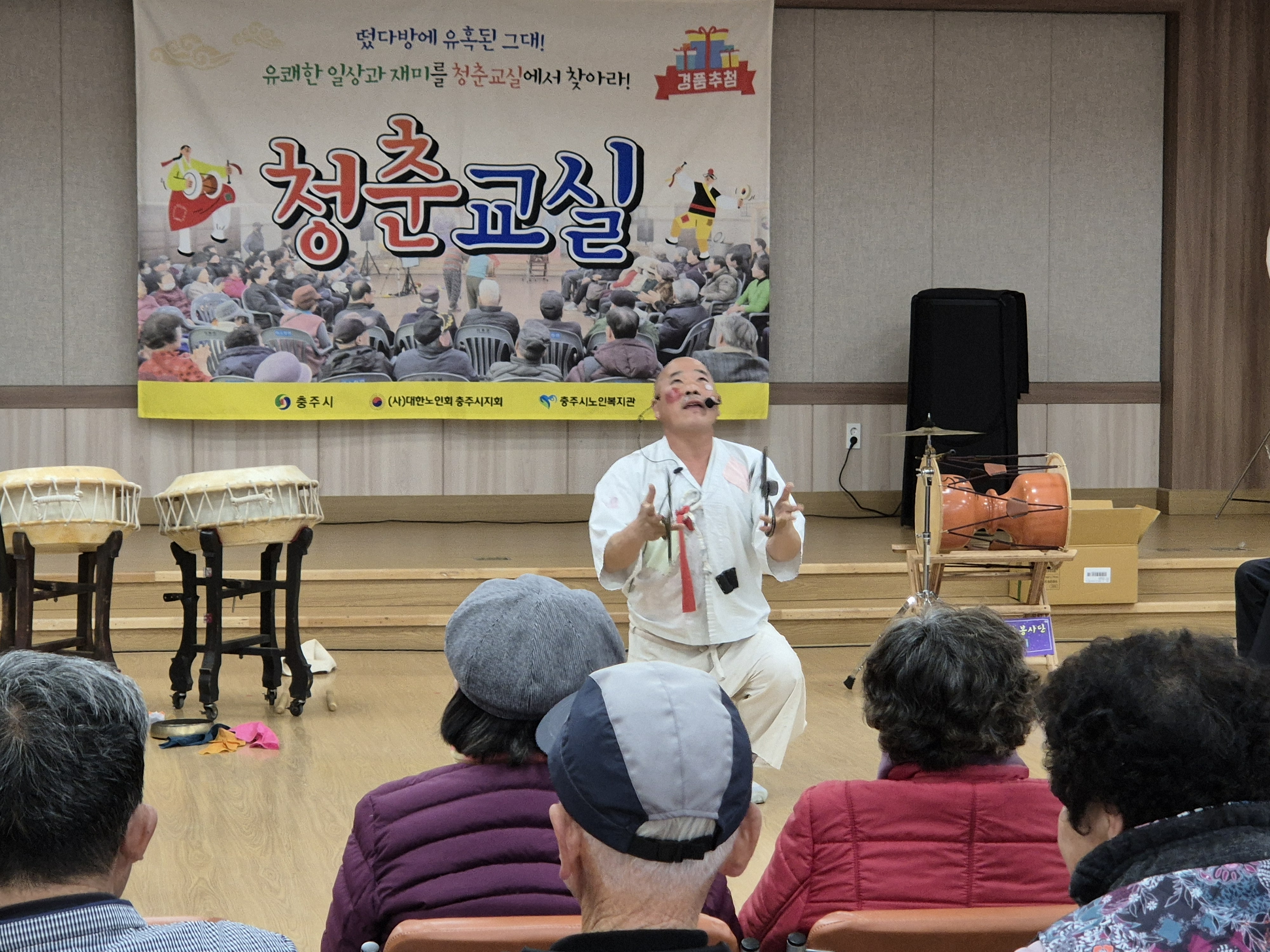 이번 청춘교실에서는 오동팔 품바님의 북 공연, 만담과 더불어 신나라 가수님의 다양한 노래공연을 관람했습니다.