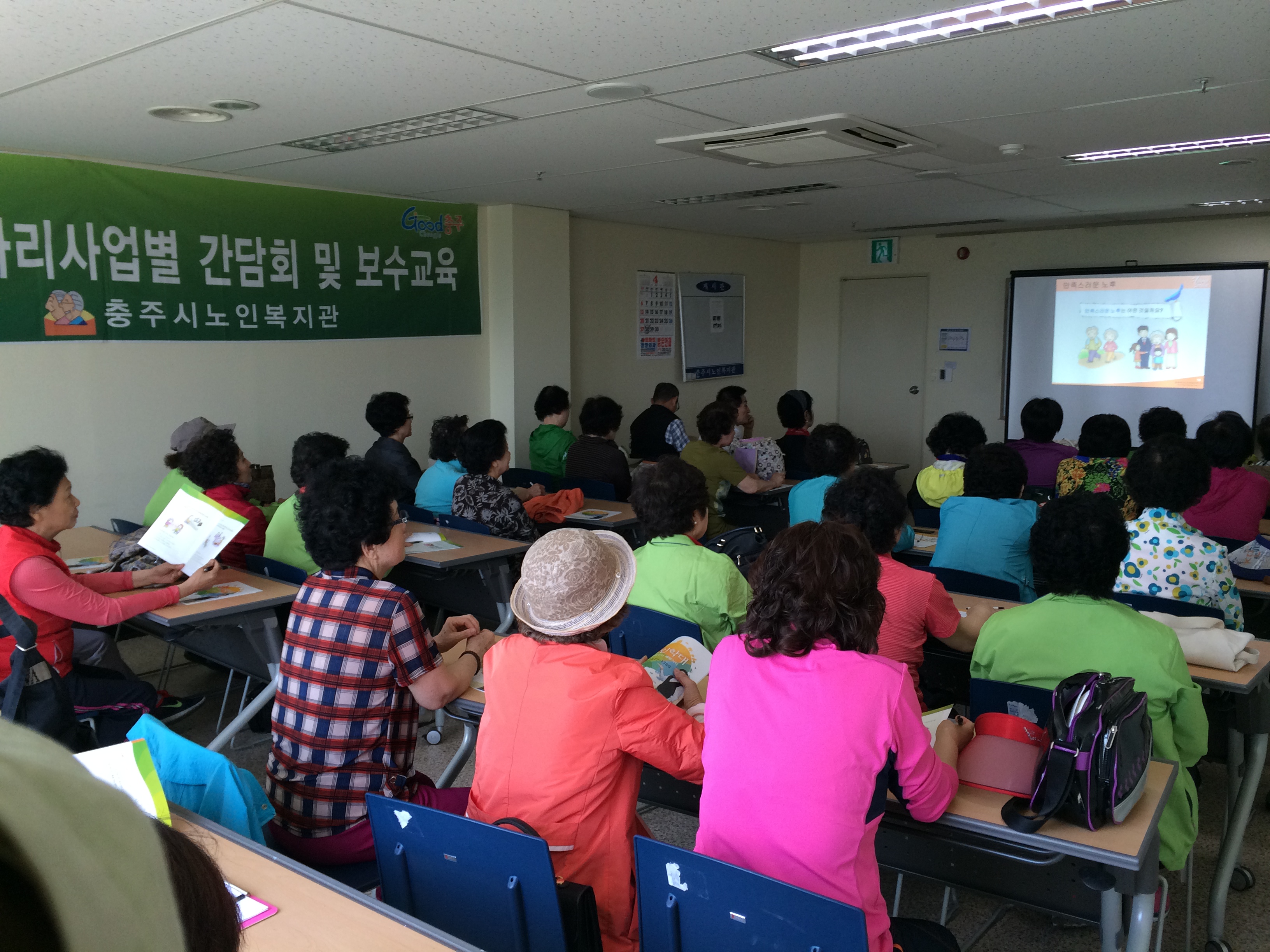 4월 21일 ~ 4월 25일동안 노인일자리 사업단별(은빛환경지킴이, 초록세상가꾸미, 어르신자치순찰대, 즐거운강사파견) 보수교육 및 정기 간담회를 충주시노인복지관 본관에서 진행하였습니다. 보수교육 및 정기 간담회를 통해 사업 활동의 원활한 운영과 참여자 어르신들의 건의 사항 및 의견을 제시하는 시간을 가졌습니다.