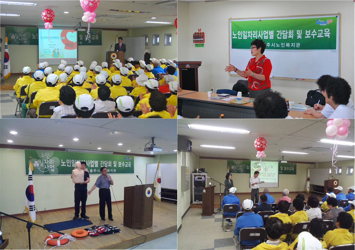 충주시노인복지관에서는 5월 21일, 22일, 29일, 30일 4일간 복지관 2층 강당에서 노인일자리사업에 참여하는 어르신 352명을 대상으로 5개 사업단별로 상반기 보수교육 및 간담회를 실시했다.
