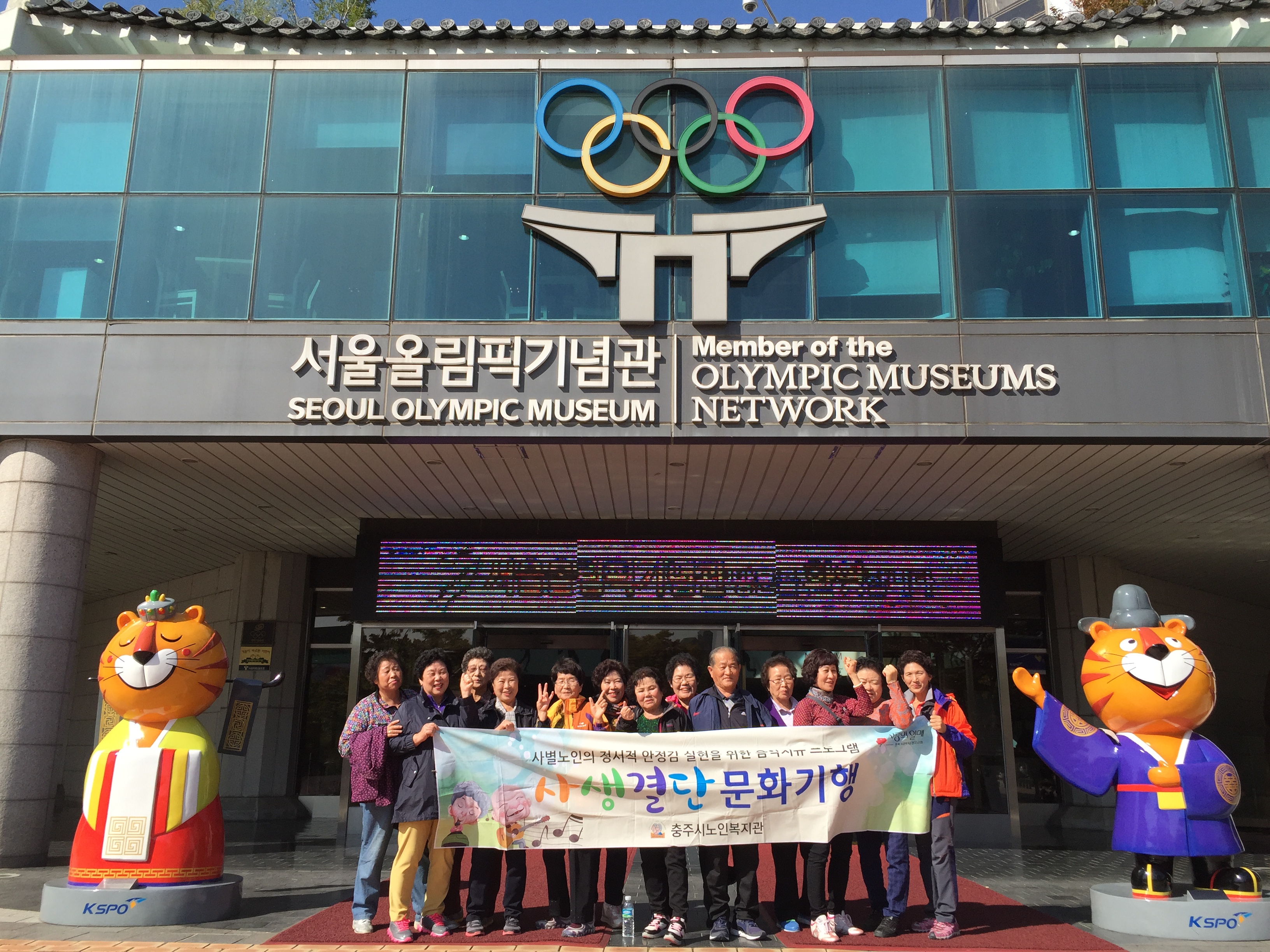 충북사회복지공동모금회 지원 사별노인의 정서적 안정감 실현을 위한 음악치유프로그램인 '사생결단' 의 2기 어르신들을 모시고 서울 올림픽공원 K-아트홀에서 ‘비가비’ 공연을 보고 올림픽 기념관 관람을 하기 위해 문화기행을 떠났습니다.