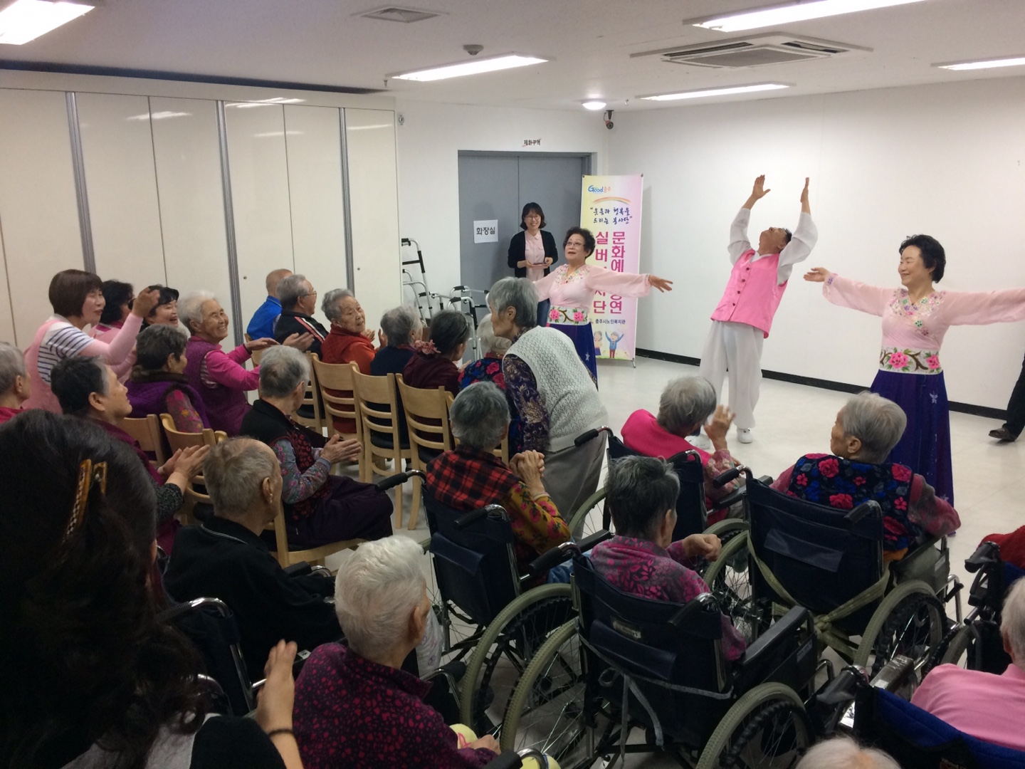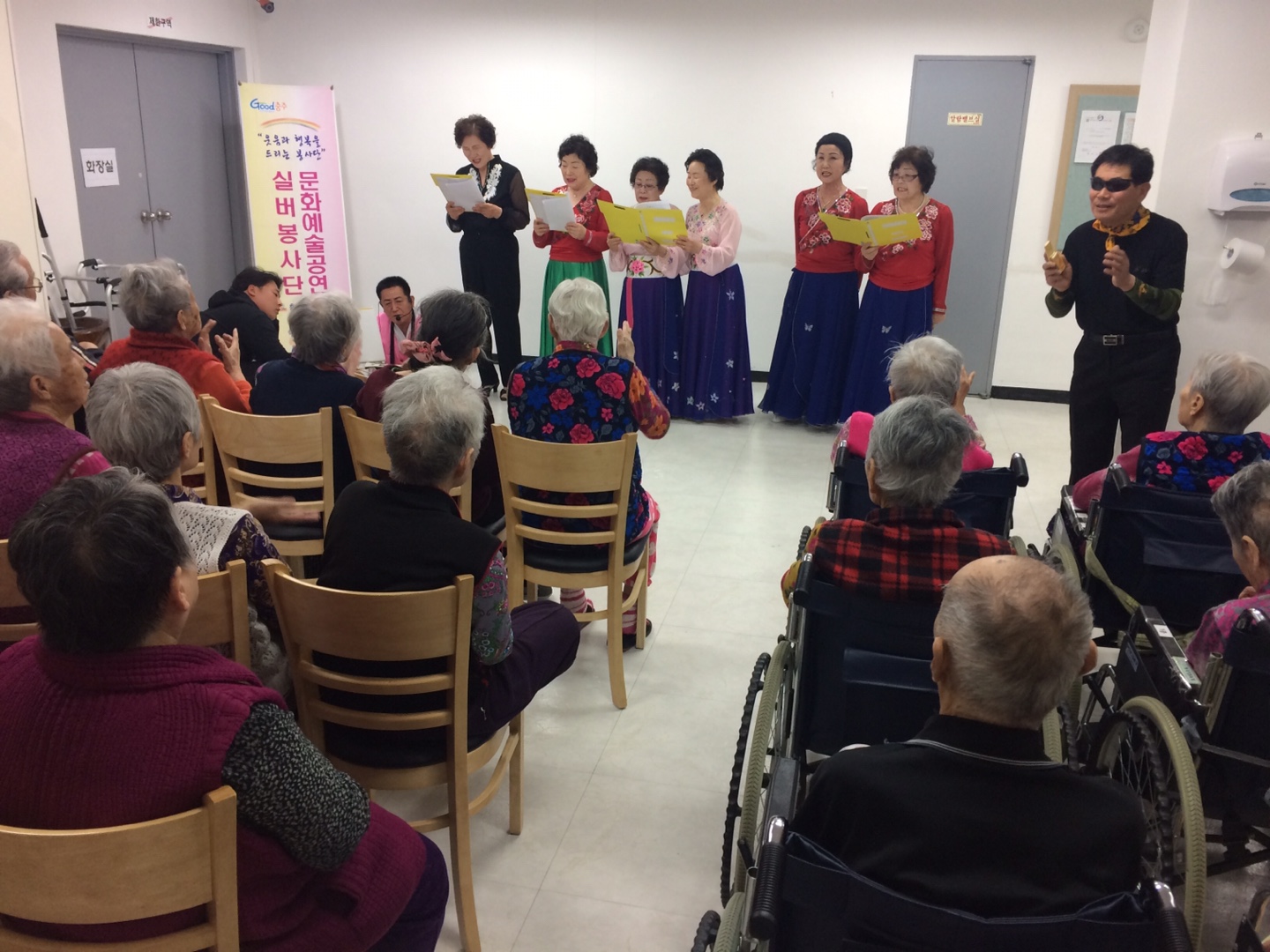 2017년 4월 27일 충주시노인복지관 문화예술공연팀은 노인요양시설인 친구가 있는 집을 방문하여 그동안 복지관에서 갈고 닦은 공연 실력을 뽐내는 시간을 가졌습니다. 자원봉사자와 요양원 어르신이 하나되어 즐겁고 보람 있는 시간을 만들었습니다. 협조해주신 친구가 있는 집 어르신 및 관계자 분들과 문화예술공연 봉사자님들에게 감사합니다.