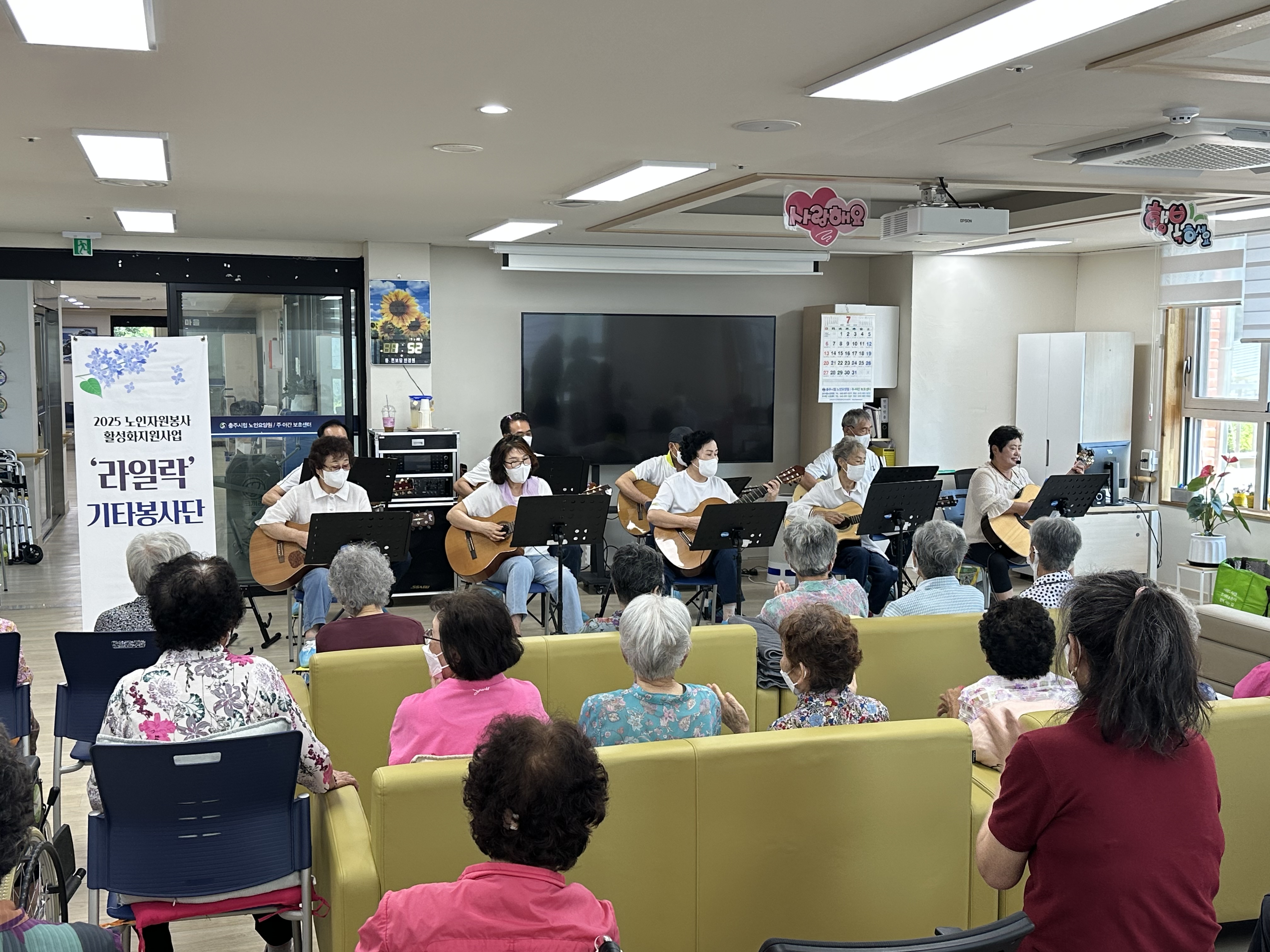 7월29일(화) 노인활성화지원사업 기타봉사단 '라일락'이 충주시립주야간보호센터에서 공연활동을 하였습니다.