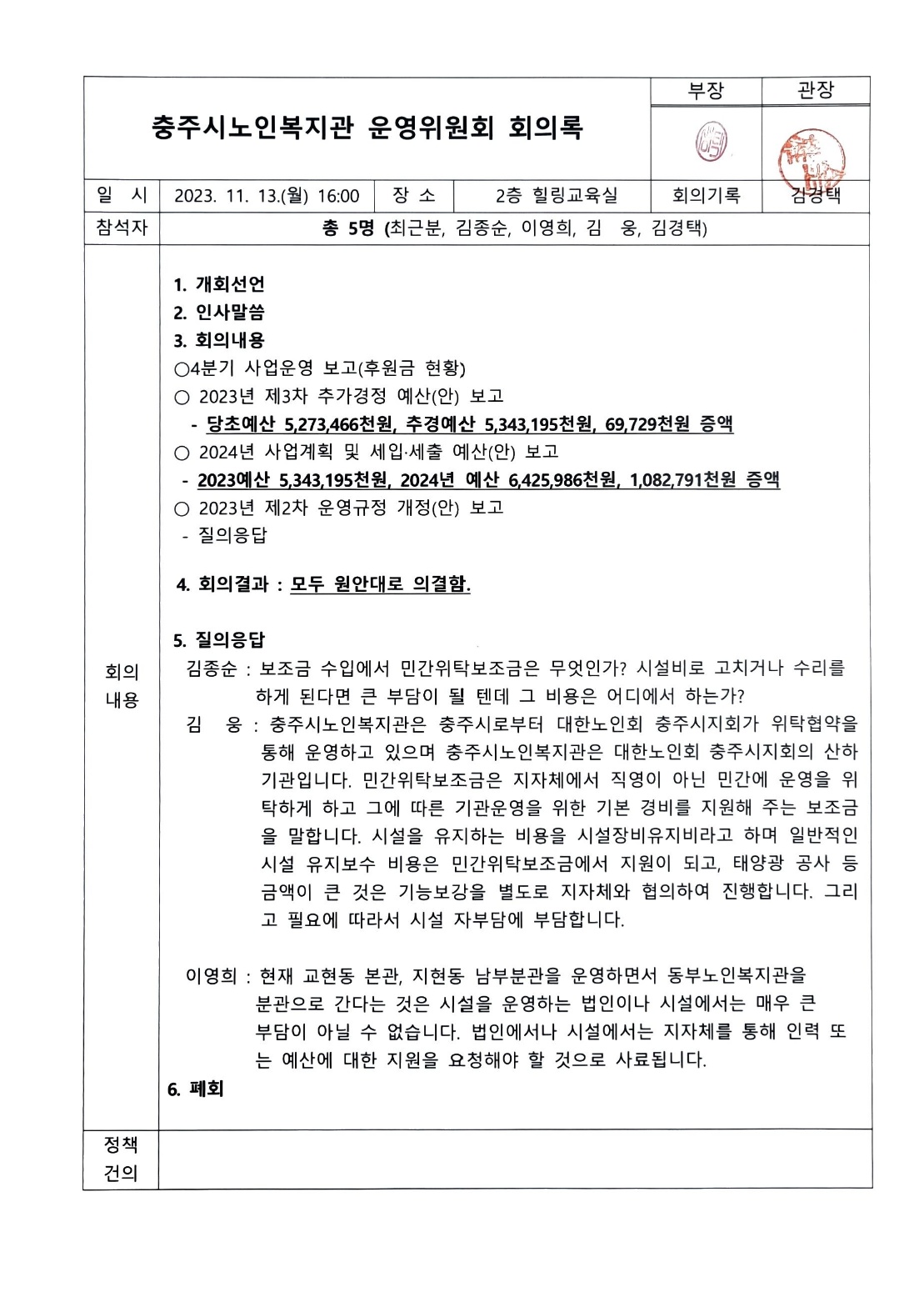 첨부. 충주시노인복지관 운영위원회 회의록 1부. 끝.