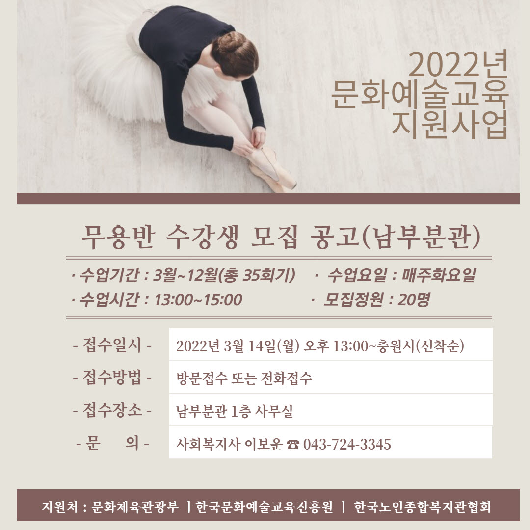 2022년 이용자 문화예술교육지원사업 무용반 수강생 모집(남부분관)