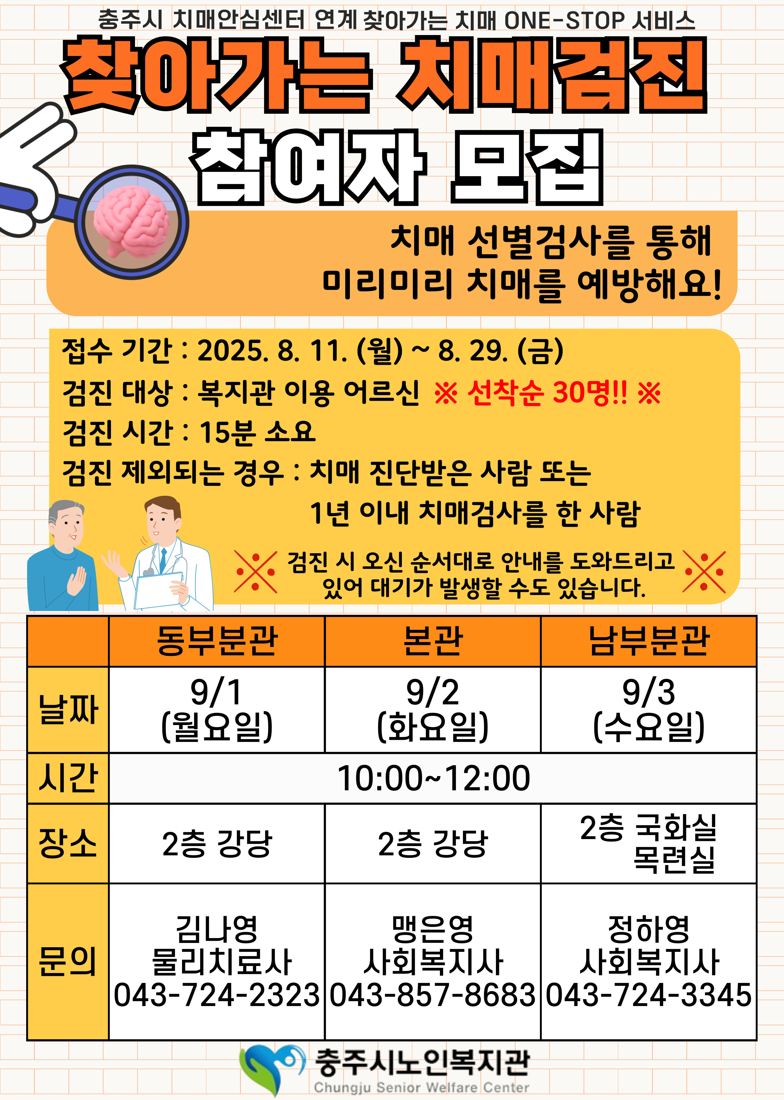 충주시 치매안심센터 연계 '찾아가는 치매검진' 참여자 모집