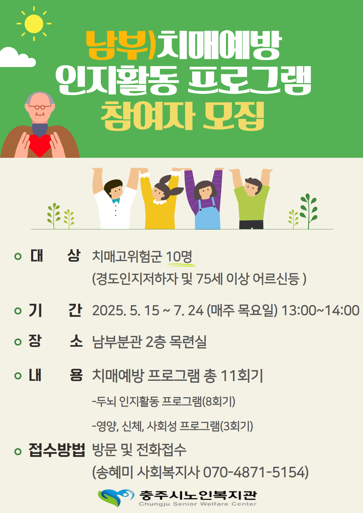 남부분관에서 치매예방 인지활동 프로그램 참여자를 모집합니다.
