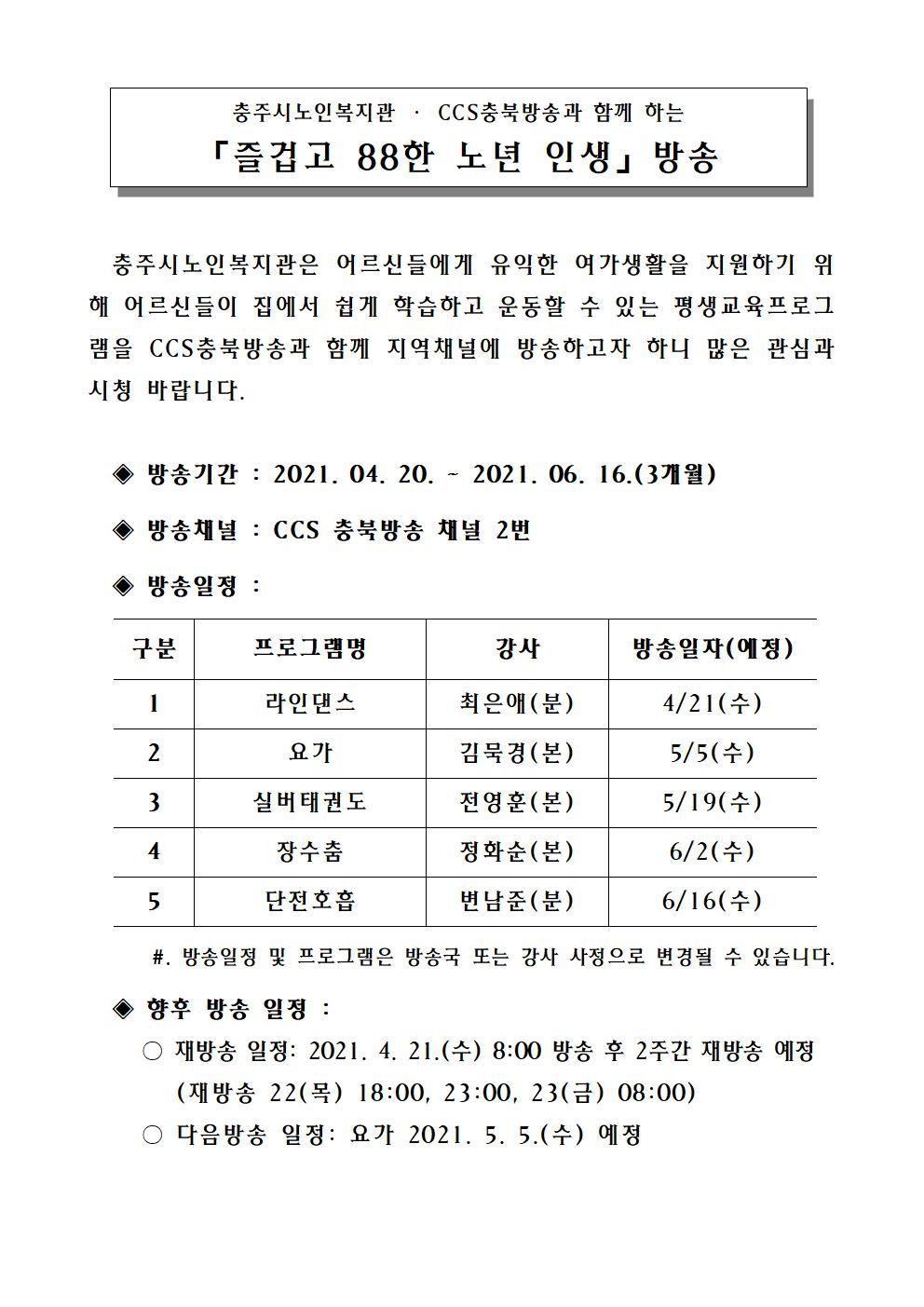 충주시노인복지관 · CCS충북방송과 함께 하는 「즐겁고 88한 노년 인생」 방송