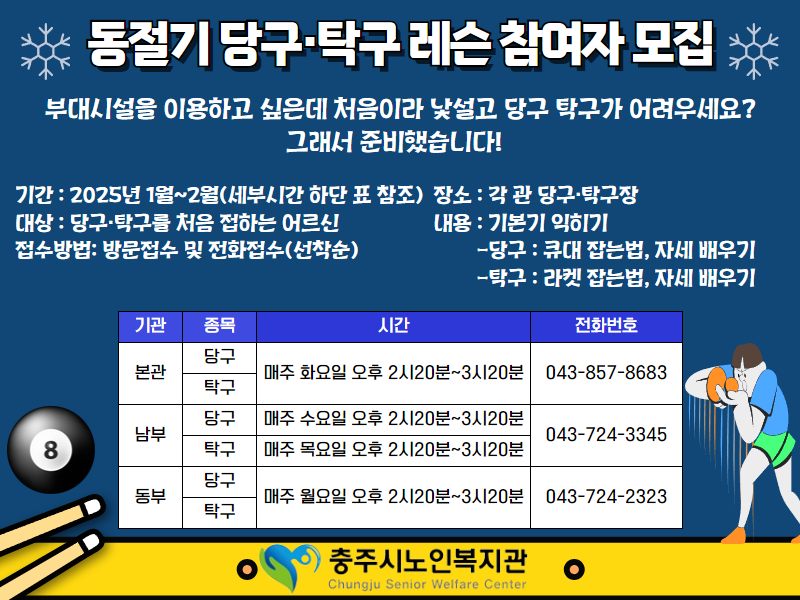 [본관, 남부분관, 동부분관] 당구, 탁구 초보 레슨 참여자 모집