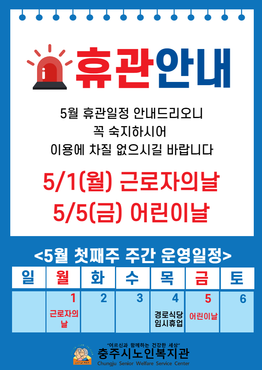 [휴관안내] 근로자의 날, 어린이날 복지관 휴관 안내