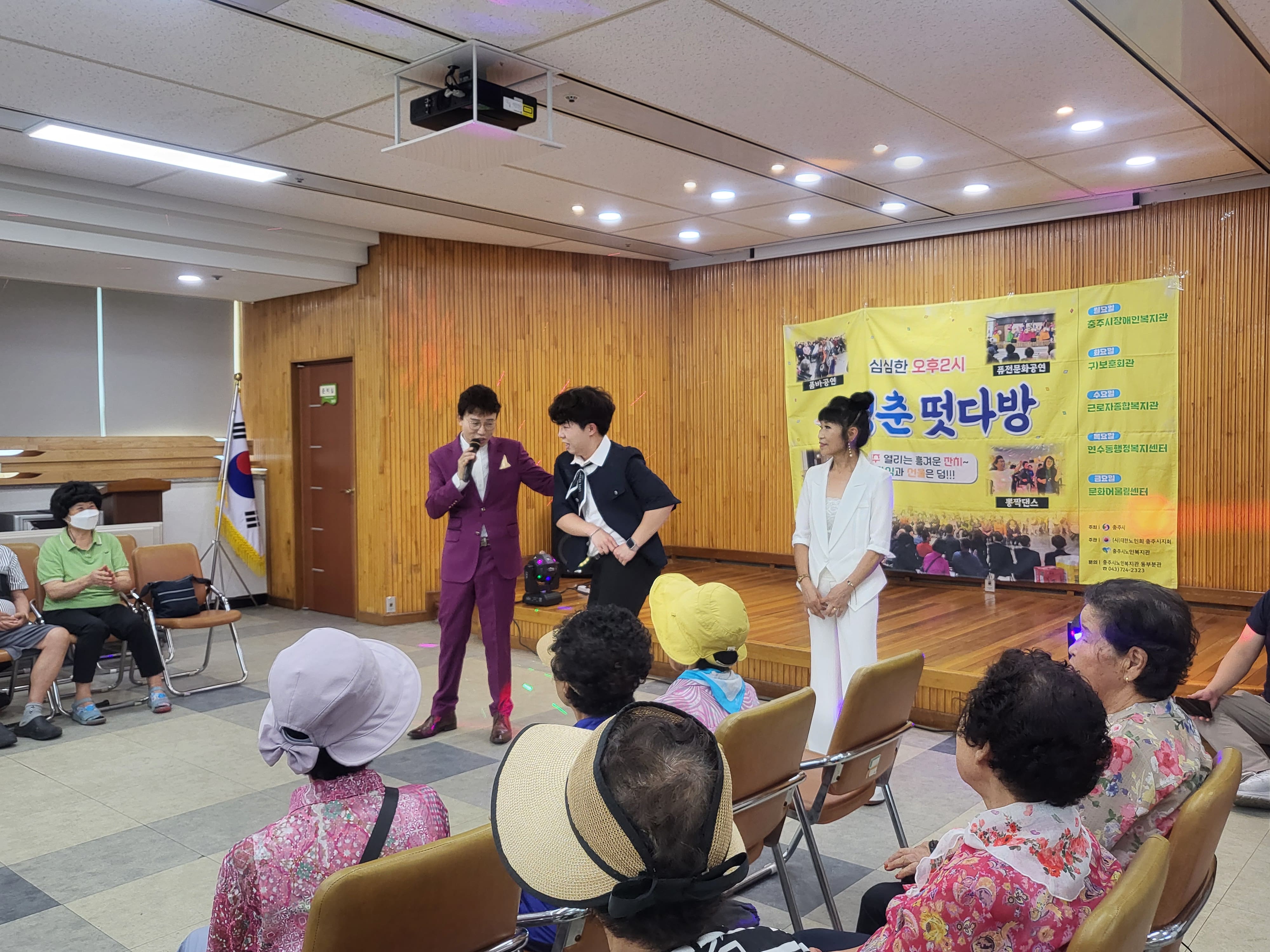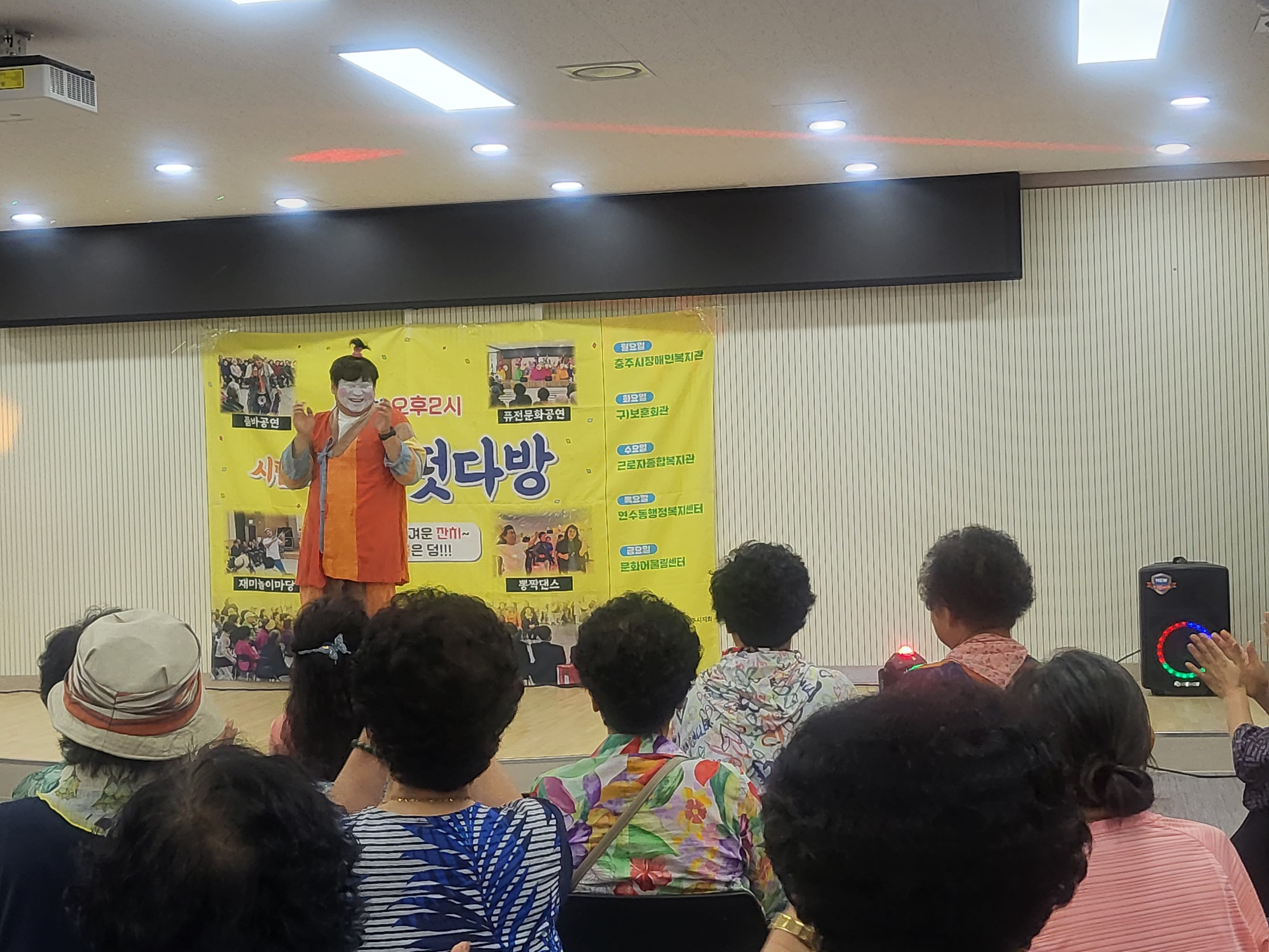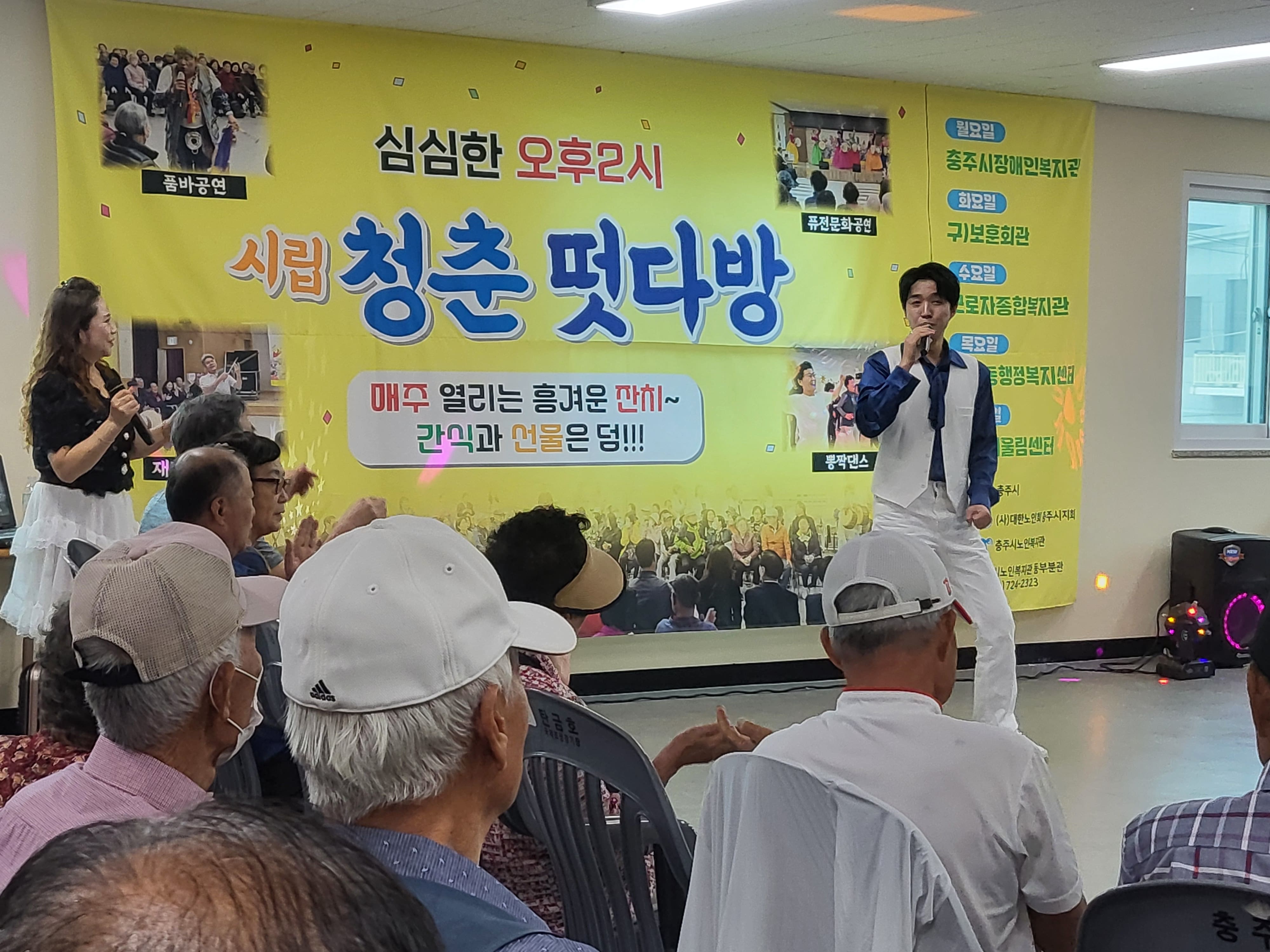 9월 공연 두번째 주는 임형규와 전철근 가수의 공연이 월,화,금요일에 신명나는 트로트와 장구 공연으로 진행되었고, 수,목요일은 삑삑이의 재미있는 마임 공연과 전철근 가수의 공연으로 어르신들이 즐거운 시간을 가졌습니다