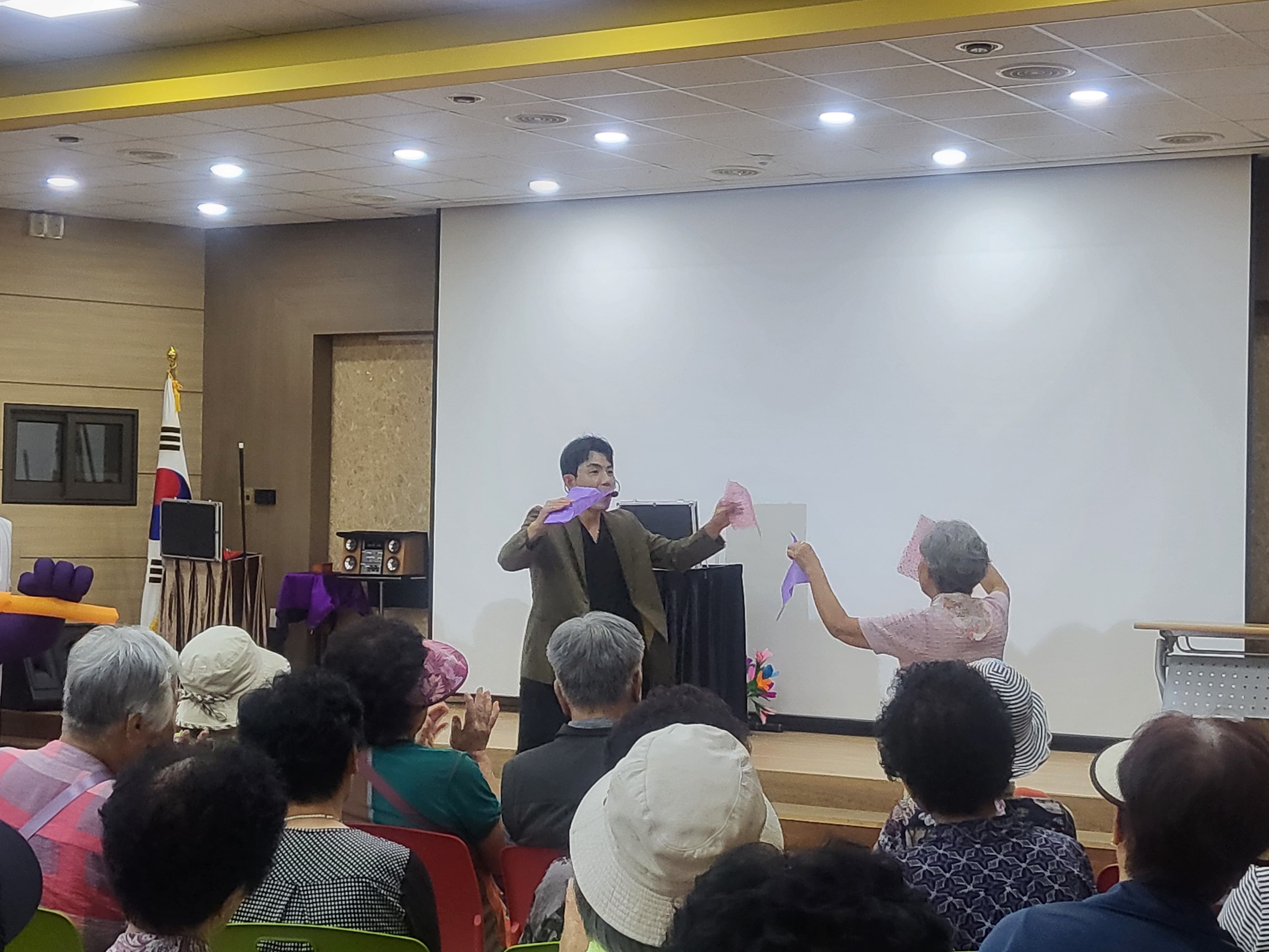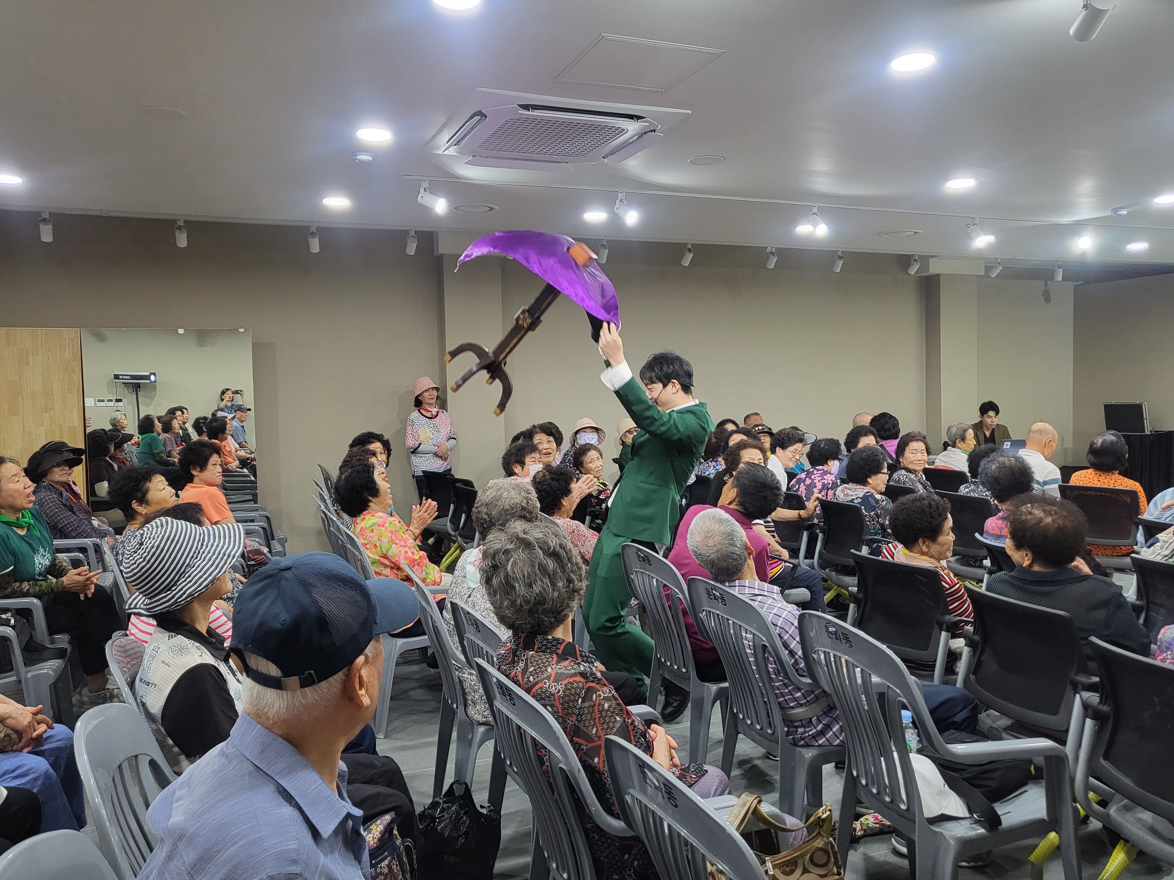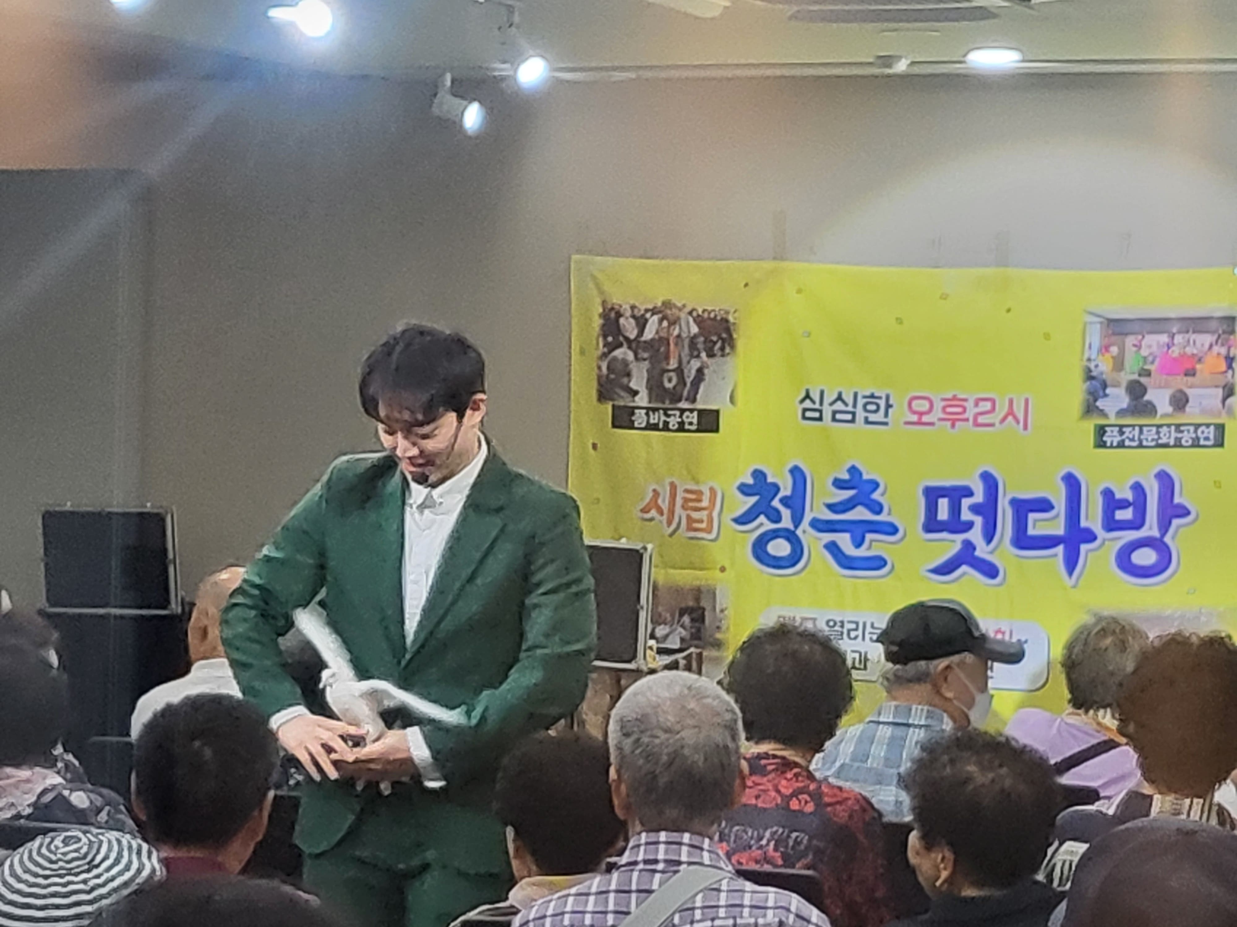 9월 첫째 주 공연은 미리내마술단의 신기한 마술 공연으로 어르신들이 동화와 같은 시간을 가졌습니다. 날아다니는 탁자와 책에서 비둘기가 나오는 장면은 어르신들이 큰 호응을 불러 일으켰습니다.