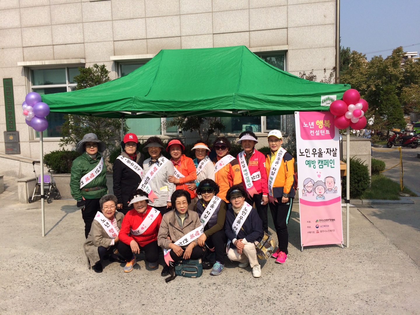 2016년 10월 14일 노년 행복컨설턴트 사업의 일환인 노인 우울, 자살 예방을 위한 캠페인을 실시하였습니다. 이번 캠페인을 통하여 노인 우울, 자살에 대한 인식을 개선하고 우울, 자살 문제를 조금이나마 예방하는 시간이였습니다. 참여해주신 노년 행복컨설턴트 참여 봉사자분들과 복지관 이용 어르신들에게 진심으로 감사드립니다^^