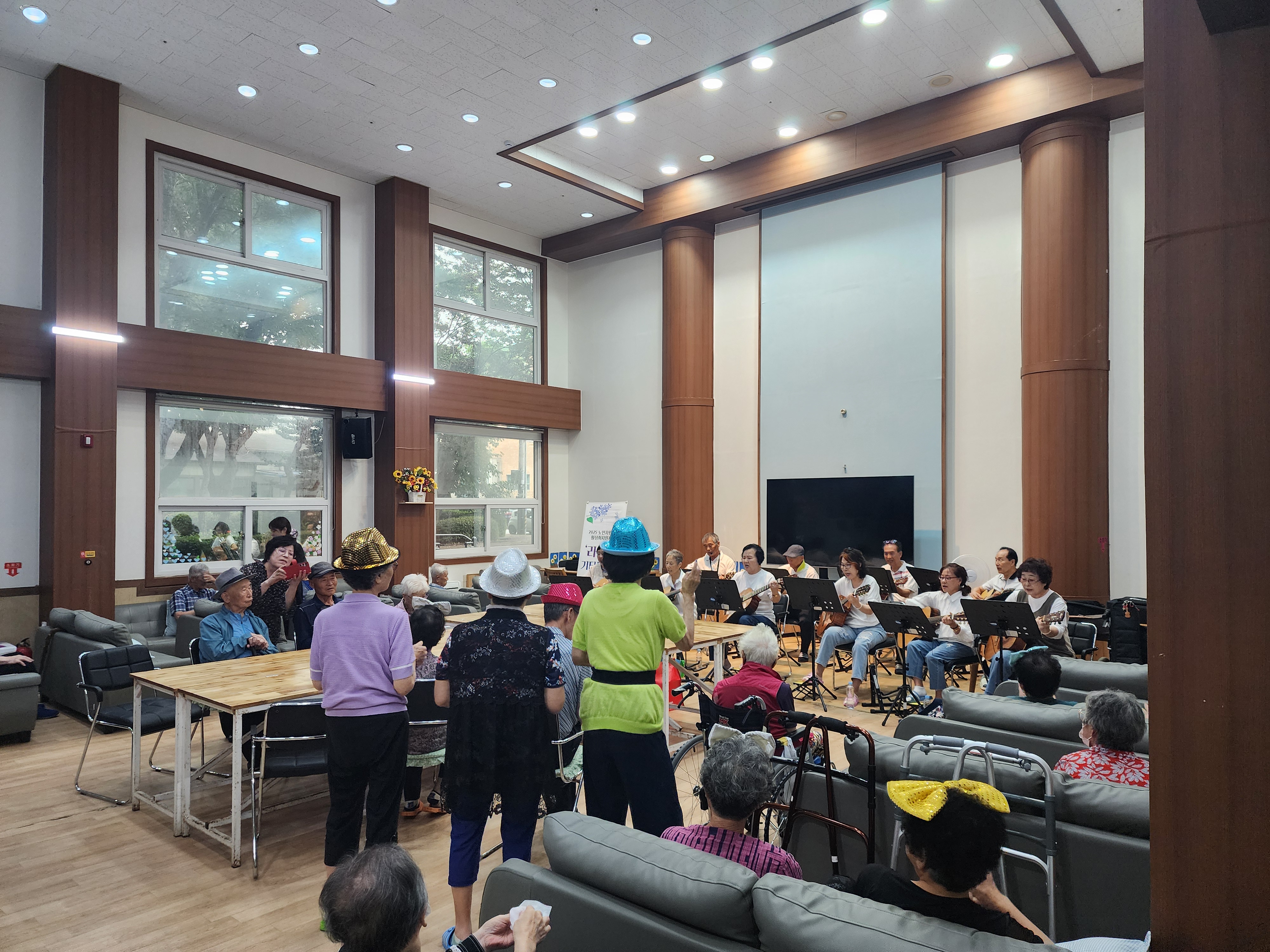 이번 공연에서는 흥겨운 기타 연주에 맞춰 춤을 추시는 어르신들도 계셨고, 다함께 박수를 치며 노래를 따라 부르는 모습에 공연장은 환한 웃음으로 가득한 공연이였으며, “덕분에 즐거운 시간을 보냈다”는 어르신들의 말씀에 봉사자들 역시 깊은 보람을 느낄 수 있었던 뜻깊은 시간이었습니다.