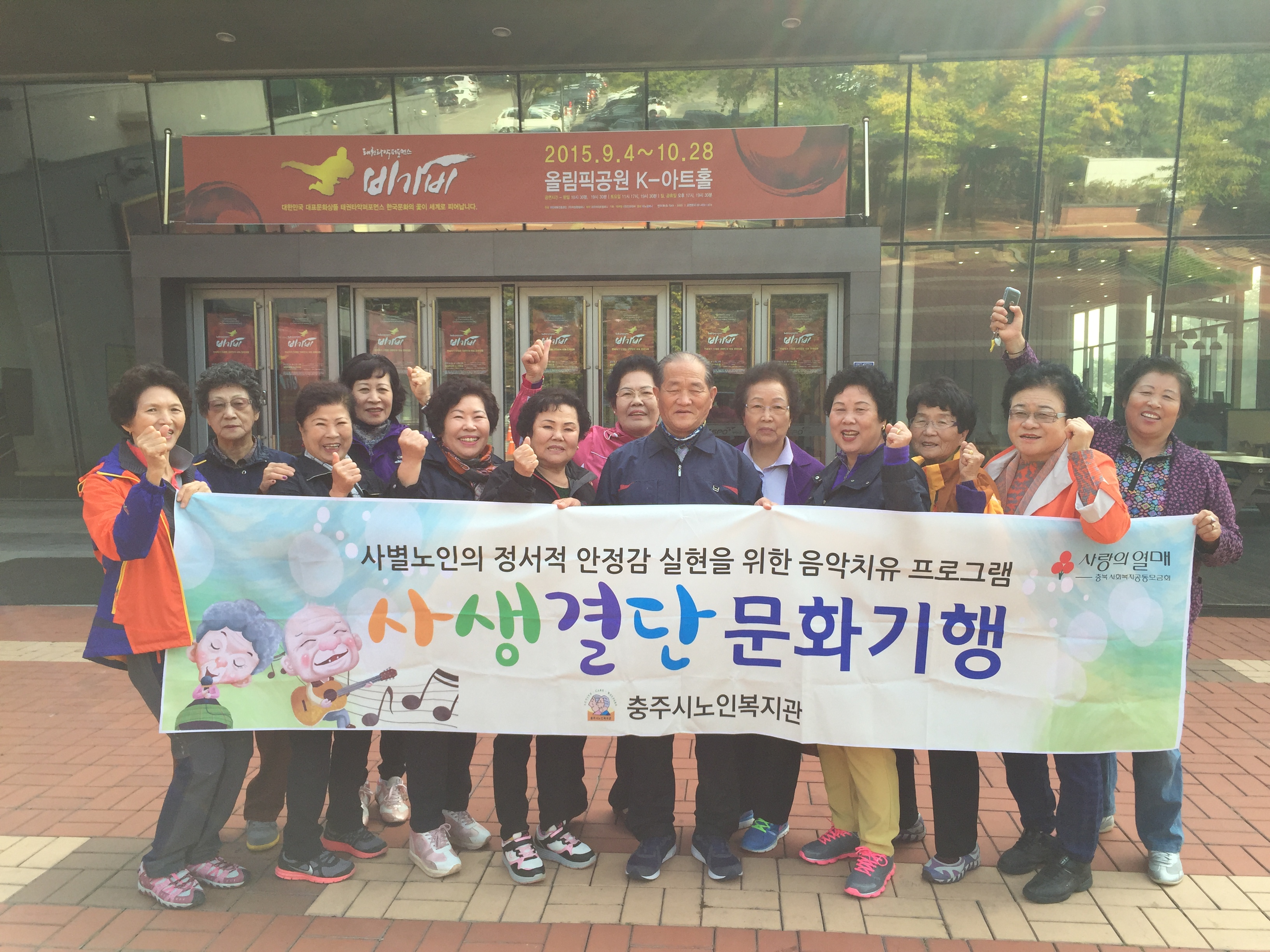 충북사회복지공동모금회 지원 사별노인의 정서적 안정감 실현을 위한 음악치유프로그램인 '사생결단' 의 2기 어르신들을 모시고 서울 올림픽공원 K-아트홀에서 ‘비가비’ 공연을 보고 올림픽 기념관 관람을 하기 위해 문화기행을 떠났습니다.