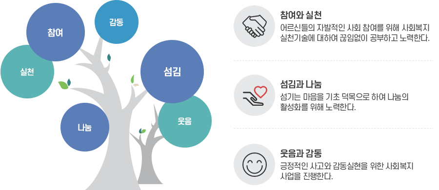 어르신과 함께하는 건강한 세상어르신의 참여와 실천을 바탕으로 한 “창조적인 노후”와 이웃의 섬김과 나눔을 통한 “행복한 세상 만들기”